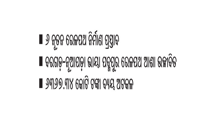 ରେଳପଥ କ୍ଷେତ୍ରରେ ଦୀର୍ଘବର୍ଷର ଅପେକ୍ଷା ପରେ ୧୪୨ କି.ମି. ଦୈର୍ଘ୍ୟବିଶିଷ୍ଟ ବରଗଡ଼-ନୂଆପଡ଼ା ଭାୟା ପଦ୍ମପୁର ନୂତନ ରେଳଲାଇନ ପ୍ରକଳ୍ପ ନିର୍ମାଣ କରିବାକୁ ପ୍ରସ୍ତାବ ରହିଛି। ଏଥିପାଇଁ ୭୦୦ କୋଟି ଟଙ୍କା ବ୍ୟୟ ଅଟକଳ ହୋଇଛି। ଏହି ପ୍ରକଳ୍ପ କାର୍ଯ୍ୟକାରୀ ହେଲେ ସମ୍ବଲପୁରଠାରୁ ରାୟପୁରର ଦୂରତା ପ୍ରାୟ ୮୦ କି.ମି. ହ୍ରାସ ପାଇବ। ସେହିପରି ବ୍ରହ୍ମପୁର-ସମ୍ବଲପୁର, ପୁରୀ-କୋଣାର୍କ ଓ ଗୁଣୁପୁର-ଥେରୁବାଲି ନୂତନ ରେଳ ପ୍ରକଳ୍ପ କାର୍ଯ୍ୟକାରୀ କରିବାକୁ ପ୍ରସ୍ତାବ ଦିଆଯାଇଛି। ତେବେ ଏଥିରୁ ଗୁଣୁପୁର-ଥେରୁବାଲି ପ୍ରକଳ୍ପ ପାଇଁ ୧୬୦୦ କୋଟି ଟଙ୍କାର ପ୍ରସ୍ତାବ ଦିଆଯାଇଛି। ଏହାବାଦ୍ ପାରାଦୀପ-ଧାମରା (୮୦ କିି.ମି.) ରେଳପ୍ରକଳ୍ପ ପାଇଁ ୧୪୭୨ କୋଟି ଟଙ୍କାର ପ୍ରସ୍ତାବ ଦିଆଯାଇଛି। ଏହି ପ୍ରକଳ୍ପ କାର୍ଯ୍ୟକାରୀ ହେଲେ ପାରାଦୀପଠାରୁ ଭଦ୍ରକ ଭାୟା କଟକ ୩୮ କି.ମି. ହ୍ରାସପାଇବ ବୋଲି ଆକ୍ସନ ପ୍ଲାନରେ ଦର୍ଶାଯାଇଛି।