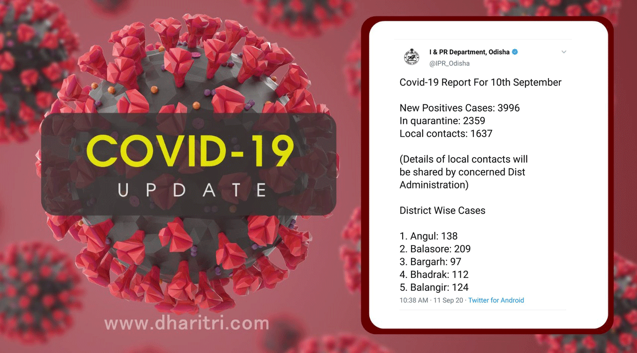 ଭୁବନେଶ୍ୱର, ୧୧।୯(ବ୍ୟୁରୋ): ରାଜ୍ୟରେ ଶୁକ୍ରବାର ୩୦ ଜିଲାରୁ ରେକର୍ଡ ସଂଖ୍ୟକ ୩୯୯୬ ନୂଆ କରୋନା ପଜିଟିଭ ଚିହ୍ନଟ ହୋଇଛନ୍ତି। ଏ ନେଇ ରାଜ୍ୟ ସୂଚନା ଓ ଲୋକ ସମ୍ପର୍କ ବିଭାଗ ପକ୍ଷରୁ ସୂଚନା ଦିଆଯାଇଛି। ଏହି ନୂଆ ଆକ୍ରାନ୍ତଙ୍କ ମଧ୍ୟରୁ ୨୩୫୯ ଜଣ କ୍ୱାରାଣ୍ଟାଇନ୍ ସେଣ୍ଟରରୁ ଚିହ୍ନଟ ହୋଇଥିବା ବେଳେ ୧୬୩୭ ଟି ଲୋକାଲ କେସ୍ ରହିଛି।