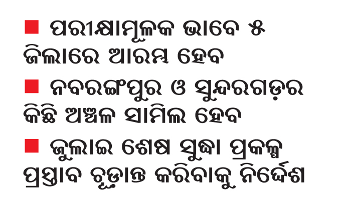 ତେବେ ଏହି ପ୍ରକଳ୍ପ ପ୍ରଥମେ କୋରାପୁଟ, ନୟାଗଡ଼, ଢେଙ୍କାନାଳ, ଦେବଗଡ଼ ଓ ସମ୍ବଲପୁର ଆଦି ୫ ଜିଲାର ୧.୧୫ ଲକ୍ଷ ହେକ୍ଟର ପରିବ୍ୟାପ୍ତ ‘ଜଳଛାୟା ପ୍ରକଳ୍ପ’ ଅଞ୍ଚଳରେ ପରୀକ୍ଷାମୂଳକ (ପାଇଲଟ୍) ଭାବେ ଆରମ୍ଭ କରିବାକୁ ବୈଠକରେ ନିଷ୍ପତ୍ତି ହୋଇଛି। ଏହି ସବୁ ଜିଲାର ୧୫୨ଟି କ୍ଷୁଦ୍ର-ଜଳଛାୟା ପ୍ରକଳ୍ପ ଅଞ୍ଚଳ ଏଥିରେ ସାମିଲ ହେବ। ପ୍ରକଳ୍ପ ସଂଲଗ୍ନ ଅଧିକ ୪.୧୧ ଲକ୍ଷ ହେକ୍ଟର ଜମିକୁ ମଧ୍ୟ ଏହି ଯୋଜନାରେ ସାମିଲ କରାଯିବ। ଏହି ସମ୍ପ୍ରସାରିତ ଅଞ୍ଚଳରେ ୫୩୩ଟି କ୍ଷୁଦ୍ର ଜଳଛାୟା ପ୍ରକଳ୍ପ ରହିଛି, ଯାହା ନବରଙ୍ଗପୁର ଏବଂ ସୁନ୍ଦରଗଡ଼ ଜିଲାରେ ରହିଛି। ଏହିପରି ଭାବେ ମୋଟ ୭ ଜିଲାର ୬୮୫ କ୍ଷୁଦ୍ର ଜଳଛାୟା ପ୍ରକଳ୍ପ ଅନ୍ତର୍ଗତ ୫.୨୬ ଲକ୍ଷ ହେକ୍ଟର ଭୂସମ୍ପତ୍ତି ଏବଂ ପ୍ରାକୃତିକ ସାଧନକୁ ପ୍ରଥମ ପର୍ଯ୍ୟାୟରେ ପ୍ରକଳ୍ପରେ ସାମିଲ କରିବା ପାଇଁ ନିଷ୍ପତ୍ତି ହୋଇଛି।