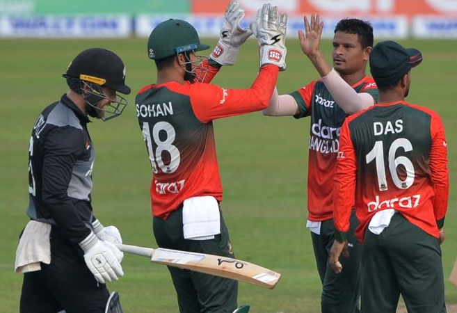 ଢାକା,୧।୯: ସ୍ଥାନୀୟ ଶେରେ ବାଂଲା ନ୍ୟାଶନାଲ ଷ୍ଟାଡିୟମରେ ବୁଧବାର ବାଂଲାଦେଶ ବିପକ୍ଷରେ ଖେଳାଯାଇଥିବା ପ୍ରଥମ ଟି୨୦ ମ୍ୟାଚ୍ରେ ନ୍ୟୁଜିଲାଣ୍ଡ ମାତ୍ର ୬୦ ରନ୍ରେ ଅଲଆଉଟ୍ ହୋଇଯାଇଛି। ଏହା ଅନ୍ତର୍ଜାତୀୟ ଟି୨୦ କ୍ରିକେଟ ଇତିହାସରେ ନ୍ୟୁଜିଲାଣ୍ଡ ପାଇଁ ସବୁଠୁ କମ୍ ଦଳଗତ ସ୍କୋର। ଘରୋଇ ବୋଲର ମୁସ୍ତାଫିଜୁର ରେହମାନ (୩), ଶାକିବ ଅଲ ହାସନ (୨), ନାସୁମ ଅହମ୍ମଦ (୨) ଓ ସେଫୁଦ୍ଦିନ (୨) ଭ୍ରମଣକାରୀ ବ୍ୟାଟ୍ସମ୍ୟାନଙ୍କୁ କ୍ରିଜ୍ରେ ଅଧିକ ସମୟ ଛିଡ଼ା କରାଇ ଦେଇ ନ ଥିଲେ। ଅଧିନାୟକ ଟମ ଲଥାମ (୧୮) ଓ ହେନରୀ ନିକୋଲାସ(୧୮)ଙ୍କୁ ଛାଡ଼ି ଦେଲେ ଅନ୍ୟ କୌଣସି ଖେଳାଳି ଛୁଇଁ ପାରି ନ ଥିଲେ ଦୁଇ ଅଙ୍କ ସ୍କୋର। ୬୧ ରନ୍ର ଛୋଟିଆ ବିଜୟ ଲକ୍ଷ୍ୟକୁ ୧୫ ଓଭରରେ ୩ ଉଇକେଟ କ୍ଷତିରେ ହାସଲ କରିନେଇଥିଲା ଘରୋଇ ବାଂଲାଦେଶ ଦଳ। ଟି୨୦ ଫର୍ମାଟରେ ଏହା ନ୍ୟୁଜିଲାଣ୍ଡ ବିପକ୍ଷରେ ବାଂଲାଦେଶର ପ୍ରଥମ ବିଜୟ।