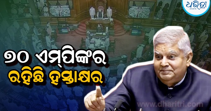 ରାଜ୍ୟ ସଭା ଅଧ୍ୟକ୍ଷ ଜଗଦୀପ ଧନଖରଙ୍କ ବିରୋଧରେ ଅବିଶ୍ୱାସ ପ୍ରସ୍ତାବରେ ପ୍ରାୟ ୭୦ବିରୋଧୀ ଏମପି ଦସ୍ତଖତ କରିଛନ୍ତି। ଯେଉଁଥିରେ କଂଗ୍ରେସ, ତ୍ରୁଣମୂଳ କଂଗ୍ରେସ, ଆମ ଆଦମୀ ପାର୍ଟି, ସମାଜବାଦି ପାର୍ଟି ଏବଂ ଅନ୍ୟାନ୍ୟ ଛୋଟ ଦଳ ମଧ୍ୟ ଏହି ପ୍ରସଙ୍ଗରେ ଏକଜୁଟ ହୋଇଛନ୍ତି।