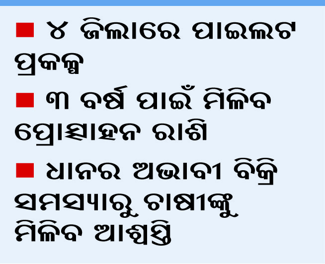 ଏହି ଯୋଜନାରେ ଫସଲର ବିବିିଧକରଣ କରି ଅଣଧାନ ଚାଷ କରିଥିବା ସମସ୍ତ ଚାଷୀଙ୍କୁ ୩ ବର୍ଷ ପାଇଁ ଡାଇରେକ୍ଟ ଟ୍ରାନ୍ସଫର ବେନିଫିଟ (ଡିବିଟି) ମାଧ୍ୟମରେ ପ୍ରୋତ୍ସାହନ ରାଶି ପ୍ରଦାନ କରାଯିବ। ଏଥିରେ ୧୬ ହଜାର ଚାଷୀ ଉପକୃତ ହେବେ। ତୈଳବୀଜ ପାଇଁ ପ୍ରତି ହେକ୍ଟରକୁ ପ୍ରଥମ ବର୍ଷ ୧୦ ହଜାର ଟଙ୍କା, ଦ୍ୱିତୀୟ ବର୍ଷ ୭ ହଜାର ଓ ତୃତୀୟ ବର୍ଷ ୫ ହଜାର ଟଙ୍କା ପ୍ରଦାନ କରାଯିବ। ସେହିପରି ରାଶି ପାଇଁ ୩୫୦୦, ୨୫୦୦ ଏବଂ ୧୮୦୦, ବାଦାମ ପାଇଁ ୧୧୦୦, ୭୭୦୦ ଓ ୫୫୦୦, କପା, ହରଡ଼ ପାଇଁ ୯୦୦୦,୬୩୦୦, ୪୫୦୦, ମକା ପାଇଁ ୬୫୦୦, ୪୫୦୦ ଓ ୩୩୦୦ ଏବଂ ପନିପରିବା ପାଇଁ ୨୨୦୦୦, ୧୫୦୦୦ ଏବଂ ୧୧୦୦୦ ଟଙ୍କା ପ୍ରୋତ୍ସାହନ ରାଶି ଆକାରରେ ପ୍ରଦାନ କରାଯିବ।
