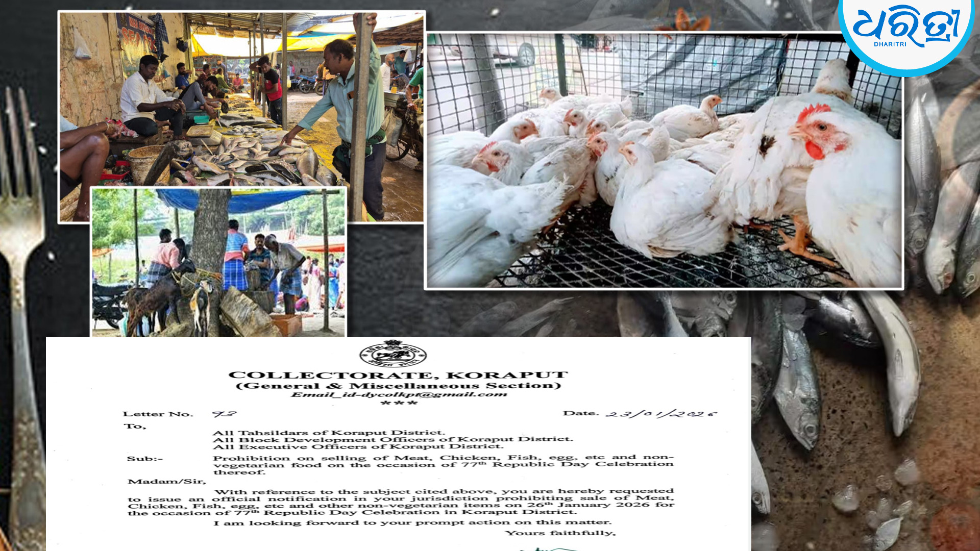 କୋରାପୁଟ,୨୩।୧(ଅମିତାଭ ବେହେରା ): ଜାନୁଆରୀ ୨୬ରେ ଅନୁଷ୍ଠିତ ହେବାକୁ ଥିବା ୭୭ ତମ ଗଣତନ୍ତ୍ର ଦିବସରେ କୋରାପୁଟ ଜିଲାରେ ଆମିଷ ବିକ୍ରି ଉପରେ ଜିଲାପ୍ରଶାସନ ପକ୍ଷରୁ କଟକଣା ଜାରି କରାଯାଇଛି। କୋରାପୁଟ ଜିଲାପାଳ ମନୋଜ ସତ୍ୟବାନ ମହାଜନ ଶୁକ୍ରବାର ଏ ସମ୍ପର୍କରେ ଜିଲାର ସମସ୍ତ ବିଡିଓ, ତହସିଲଦାର ଓ ନିର୍ବାହୀ ଅଧିକାରୀ ମାନଙ୍କୁ ଚିଠି କରି ଏହା କଡାକଡି ଭାବେ ରୂପାୟନ କରିବାକୁ ନିର୍ଦ୍ଦେଶ ଦେଇଛନ୍ତି। ଜାନୁଆରୀ ୨୬ ସୋମବାର ଦିନ ଜିଲାର ସବୁ ଅଞ୍ଚଳରେ ଯେପରି ଛେଳି ମାଂସ, କୁକୁଡ଼ା ମାଂସ,ମାଛ, ଅଣ୍ଡା ଏବଂ ଅନ୍ୟାନ୍ୟ ଆମିଷ ଜାତୀୟ ଖାଦ୍ୟ ବିକ୍ରି ନହୁଏ ସେଥିପ୍ରତି କଡ଼ା ନଜର ରଖିବାକୁ ନିର୍ଦ୍ଦେଶ ହୋଇଛି।