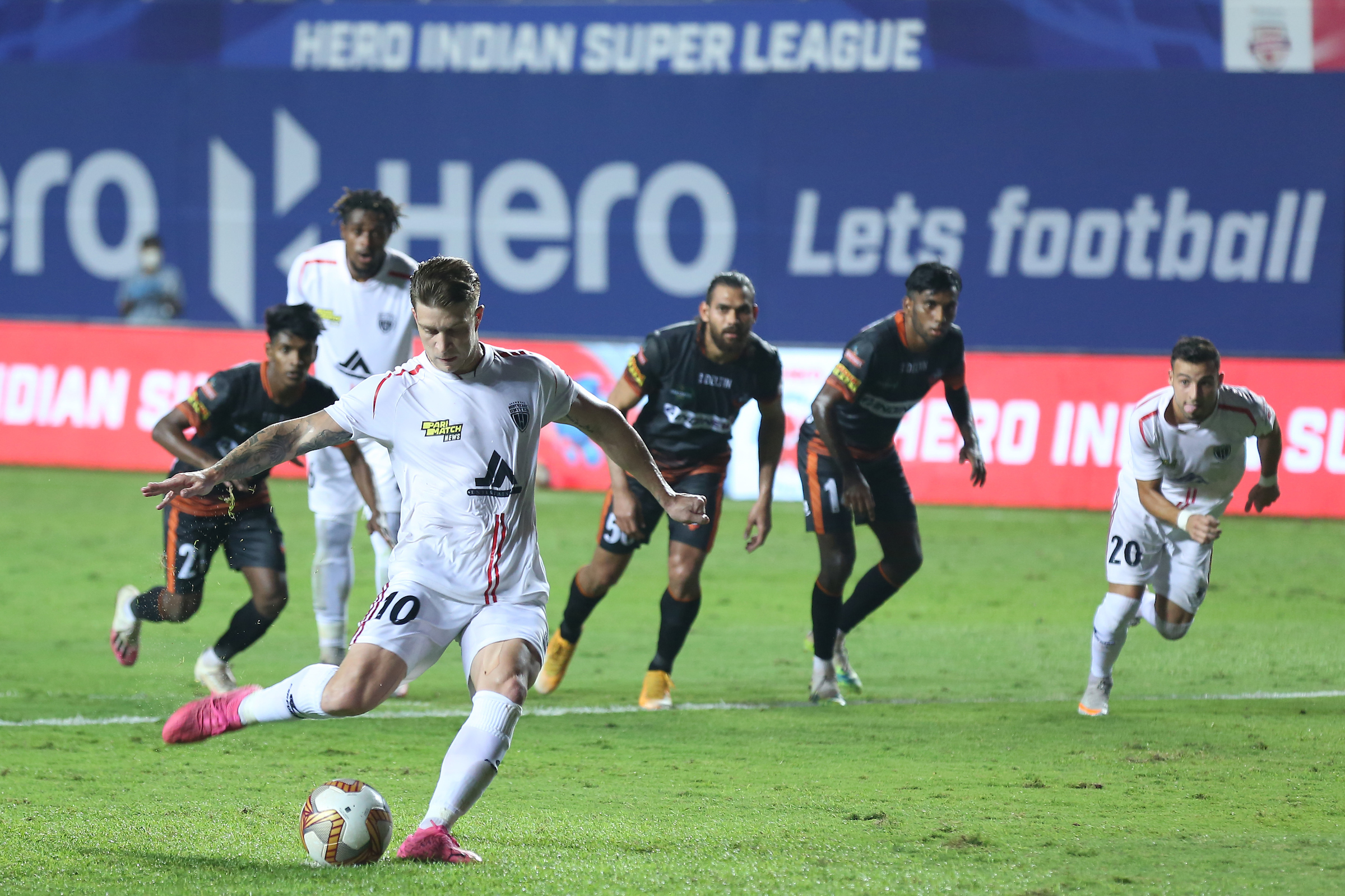 Federico Gallego Revetria of NorthEast United FC kick the ball for goal during match 82 of the 7th season of the Hero Indian Super League between NorthEast United FC and FC Goa held at the Tilak Maidan Stadium, Goa, India on the 4th February 2021 Photo by Arjun Singh / Sportzpics for ISL