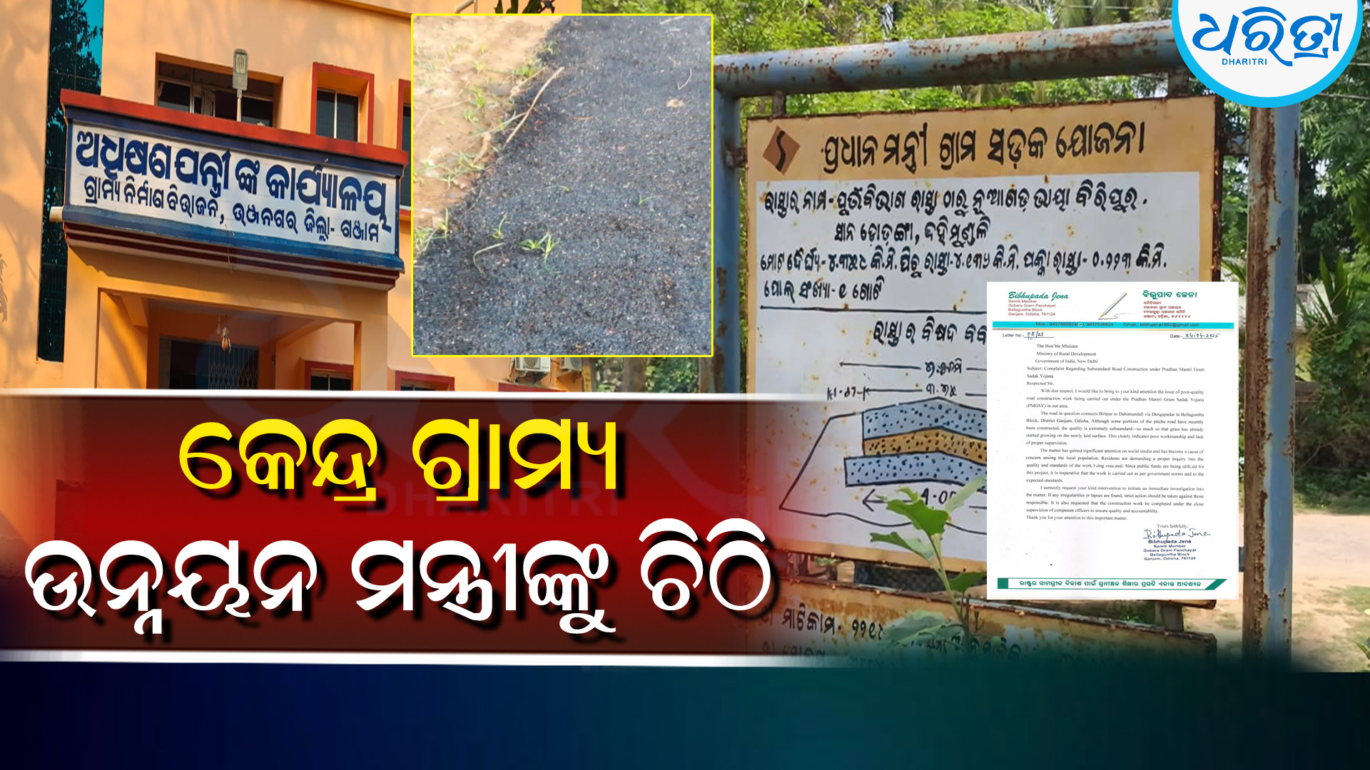 ଭଞ୍ଜନଗର,୨୯ା୪(ବାବୁଲା ପ୍ରଧାନ)-ଗଞ୍ଜାମ ଜିଲା ଭଞ୍ଜନଗର ଗ୍ରାମ୍ୟ ଉନ୍ନୟନ ବିଭାଗ ଅଧୀକ୍ଷଣ ଯନ୍ତ୍ରୀଙ୍କ ଅଧୀନରେ ଥିବା ନୂଆଗଡ ଭାୟା ବିରିପୁର ଡେଙ୍ଗାପଦର ରାସ୍ତା ପ୍ରଧାନମନ୍ତ୍ରୀ ଗ୍ରାମ୍ୟ ସଡ଼କ ଯୋଜନାରେ ନିର୍ମିତ ହେଉଛି। ତେବେ ହେଉଥିବା ଏହି ରାସ୍ତା କାମ ନିମ୍ନମାନର ହେଉଥିବା ଅଭିଯୋଗ କରି ଏନେଇ ଗୋବରା ସମିତିସଭ୍ୟ ବିଭୂପାଦ ଜେନା କେନ୍ଦ୍ର ଗ୍ରାମ୍ୟ ଉନ୍ନୟନ ମନ୍ତ୍ରୀଙ୍କୁ ଚିଠି ଲେଖି ଆବଶ୍ୟକ ପଦକ୍ଷେପ ନେବାକୁ ଦାବି କରିଛନ୍ତି। ନଚେତ୍ ଆଗାମୀ ଦିନରେ ଅଞ୍ଚଳବାସୀ ଆନ୍ଦୋଳନକୁ ଓହ୍ଲାଇବେ ବୋଲି ସେ ଚିଠିରେ ଉଲ୍ଲେଖ କରିଛନ୍ତି।