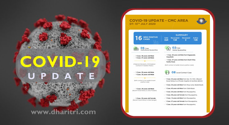 କଟକ ଅଫିସ,୧୩।୭: କଟକ ସହରରୁ ସୋମବାର ଆଉ ୧୬ କରୋନା ପଜିଟିଭ୍ ଚିହ୍ନଟ ହୋଇଛନ୍ତି। ସେଥିମଧ୍ୟରୁ ୬ ଜଣ ଇନ୍ଷ୍ଟିଚ୍ୟୁଶନାଲ କ୍ୱାରାଣ୍ଟାଇନ୍ରେ ଥିବାବେଳେ ୨ ଜଣ ହୋମ କ୍ୱାରାଣ୍ଟାଇନ୍ରେ ରହିଛନ୍ତି। ଏହାସହ ୮ଟି ଲୋକାଲ କେସ ରହିଛି।
