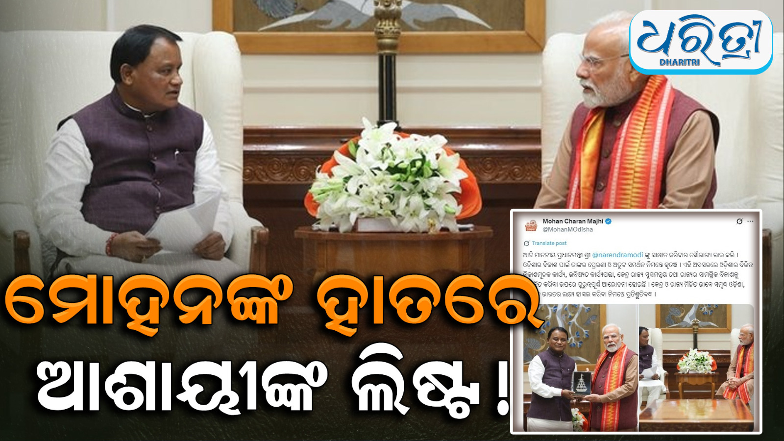 ତେବେ ଏହା ପୂର୍ବରୁ ମଧ୍ୟ ଓଡ଼ିଶାର ଭାଜପା ସରକାରର ପ୍ରଥମ ବାର୍ଷିକୀ ଅବସରରେ ପ୍ରଧାନମନ୍ତ୍ରୀଙ୍କ ଓଡ଼ିଶା ଆସିଥିଲେ। ସେହି ସମୟରେ ମଧ୍ୟ ଭାଜପା କାର୍ଯ୍ୟାଳୟରେ ବଡ଼ ମିଟିଂ ହୋଇଥିଲା। କିନ୍ତୁ ମାସେ ନ ପୁରୁଣୁ ଦିଲ୍ଲୀ ଯାଇ ମୋଦିଙ୍କୁ ମୁଖ୍ୟମନ୍ତ୍ରୀଙ୍କୁ ଭେଟିବା ରାଜନୀତିରେ ଚର୍ଚ୍ଚାକୁ ଉଷ୍ଣ କରୁଛି । ରାଜନୈତିକ ବିଶେଷଜ୍ଞଙ୍କ ମତରେ ଏହି ସାକ୍ଷାତକାରରେ ମନ୍ତ୍ରୀମଣ୍ଡଳର ସମ୍ପ୍ରସାରଣ ଓ ନିଗମ ବୋର୍ଡ ଅଧ୍ୟକ୍ଷ ଚୟନ ନେଇ ଆଲୋଚନା ହୋଇଛି। ସେହି ସମୟରେ ଫଟୋରେ ମଧ୍ୟ ଦେଖାଯାଇଛି କି ମୋହନଙ୍କ ହାତରେ ଏକ ଏକ ଫାଇଲ ମଧ୍ୟ ଥିଲା।