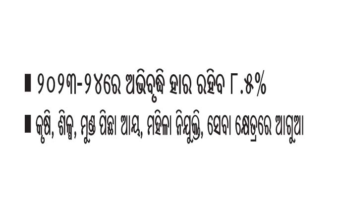 ୨୦୨୧-୨୨ରେ ରାଜ୍ୟର ସାମଗ୍ରିକ ଘରୋଇ ଅଭିବୃଦ୍ଧି ୧୧.୫ ପ୍ରତିଶତ ଥିଲା। କୋଭିଡ୍ ସତ୍ତ୍ୱେ ୨୦୧୩-୧୪ରୁ ୨୦୨୧-୨୨ ମଧ୍ୟରେ ରାଜ୍ୟର ଅଭିବୃଦ୍ଧି ୭.୯ ପ୍ରତିଶତ ରହିଛି। ବିଶ୍ବରେ ଆର୍ଥିକ ମାନ୍ଦାବସ୍ଥା ସତ୍ତ୍ୱେ ରାଜ୍ୟ ରାଜସ୍ବ ସଂଗ୍ରହରେ ରେକର୍ଡ ସୃଷ୍ଟି କରିଥିବା ବେଳେ ମୁଣ୍ଡ ପିଛା ଆୟ ବଢିଛି। ରାଜ୍ୟରେ ମୁଣ୍ଡ ପିଛା ଆୟ ୧ ଲକ୍ଷ ୫୦ହଜାର ୬୭୬ ରହିଥିବା ବେଳେ ଜାତୀୟ ସ୍ତରରେ ଏହା ୧ ଲକ୍ଷ ୭୦ ହଜାର ୬୨୦ ଟଙ୍କା ରହିଛି। ରାଜ୍ୟରେ ଏହି ମୁଣ୍ଡ ପିଛା ଆୟ ୨୦୧୫-୧୬ରେ ୯୪,୭୯୭ ଟଙ୍କା ରହିଥିଲା। ଗତ ୭ ବର୍ଷରେ ଓଡ଼ିଶା ଏବଂ ଜାତୀୟ ହାର ମଧ୍ୟରେ ମୁଣ୍ଡ ପିଛା ଆୟର ଦୂରତାକୁ ହ୍ରାସ କରିବାରେ ରାଜ୍ୟ ସଫଳ ହୋଇଛି। ଜାତୀୟ ସ୍ତରରେ ୨୦୧୫-୧୬ରେ ମୁଣ୍ଡ ପିଛା ଆୟ ୩୧.୬ ପ୍ରତିଶତ ଥିବା ବେଳେ ୨୦୨୨-୨୩ରେ ଏହାର ଦୂରତା ୧୨ ପ୍ରତିଶକୁ ଖସି ଆସିଛି। ୨୦୧୧-୧୨ରୁ ୨୦୨୨-୨୩ ମଧ୍ୟରେ ମୁଣ୍ଡ ପିଛା ଆୟ ୧୦.୯ ପ୍ରତିଶତ ବଢ଼ିଛି। ଏହି ସମୟରେ ଜାତୀୟ ସ୍ତର ଅଭିବୃଦ୍ଧି ୯.୪ ପ୍ରତିଶତ ରହିଛି। ରୁଷିଆ-ୟୁକ୍ରେନ୍ ଯୁଦ୍ଧ ଯୋଗୁ ବିଶ୍ୱସ୍ତରରେ ଯୋଗାଣ ବ୍ୟବସ୍ଥା ବିପର୍ଯ୍ୟସ୍ତ ହୋଇଛି। ଶକ୍ତି ଓ ଅନ୍ୟାନ୍ୟ ସାମଗ୍ରୀର ଦାମ ବୃଦ୍ଧି ପାଇଛି। ୨୦୨୨-୨୩ରେ ମୁଦ୍ରସ୍ପୀତି ହାର ବୃଦ୍ଧି ପାଇଛି। ରାଜ୍ୟରେ ୨୦୨୧-୨୨ରେ ମୁଦ୍ରାସ୍ପୀତି ୩.୭ ପ୍ରତିଶତ ଥିବାବେଳେ ୨୦୨୨ ଡିସେମ୍ବର ସୁଦ୍ଧା ଏହା ୬.୬୫ ପ୍ରତିଶତ ହୋଇଛି। ୨୦୨୨-୨୩ ଆର୍ଥିକ ବର୍ଷରେ ଜାତୀୟ ସ୍ତରରେ କୃଷି କ୍ଷେତ୍ରରେ ଅଭିବୃଦ୍ଧି ହାର ୩.୫ ପ୍ରତିଶତ ଆକଳନ କରାଯାଇଥିବା ବେଳେ ଓଡ଼ିଶାରେ ଅଭିବୃଦ୍ଧି ହାର ୬ ପ୍ରତିଶତ ହେବ ବୋଲି ରିପୋର୍ଟରେ ଦର୍ଶାଯାଇଛି।