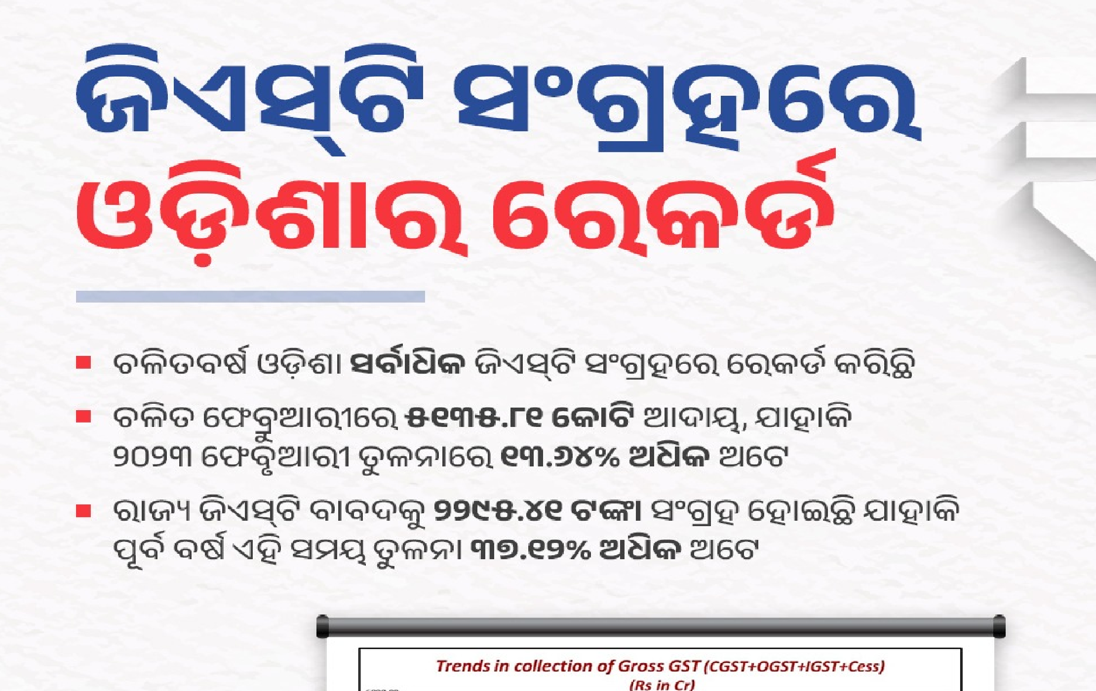 ଭୁବନେଶ୍ୱର,୧ା୩: ଗତ ଫେବୃଆରୀ ମାସରେ ଓଡ଼ିଶାରେ ସଂଗ୍ରହ ହୋଇଛି ସର୍ବକାଳୀନ ସର୍ବାଧିକ ମୋଟ ବସ୍ତୁ ଏବଂ ସେବା କର(ଜିଏସ୍ଟି)। ୨୦୨୪ ଫେବୃଆରୀରେ ୫୧୩୫.୮୧ କୋଟି ଟଙ୍କା ଜିଏସ୍ଟି ସଂଗ୍ରହ ହୋଇଛି ଯାହା ଫେବୃଆରୀ ୨୦୨୩ ରେ ୪୫୧୯.୩୫ କୋଟି ଥିଲା। ଅର୍ଥାତ ବାର୍ଷିକ ତୁଳନାରେ ଏଥିରେ ୧୩.୬୪% ଅଭିବୃଦ୍ଧି ପଞ୍ଜିକୃତ ହୋଇଛି।