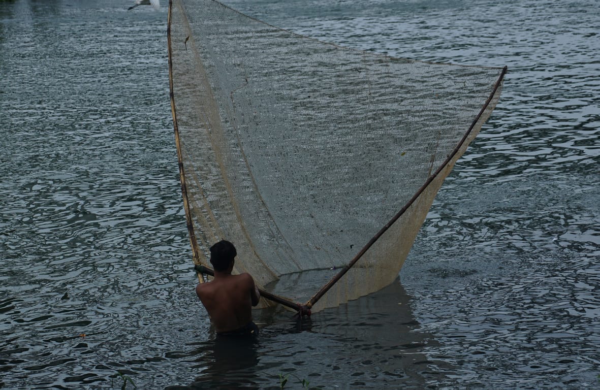 ଯୋବ୍ରା ରେଳ ବ୍ରିଜ୍, କଟକ ଠାରେ ମହାନଦୀରେ ମତ୍ସ୍ୟଜୀବୀ ମାନେ ମାଛ ଧରୁଛନ୍ତି