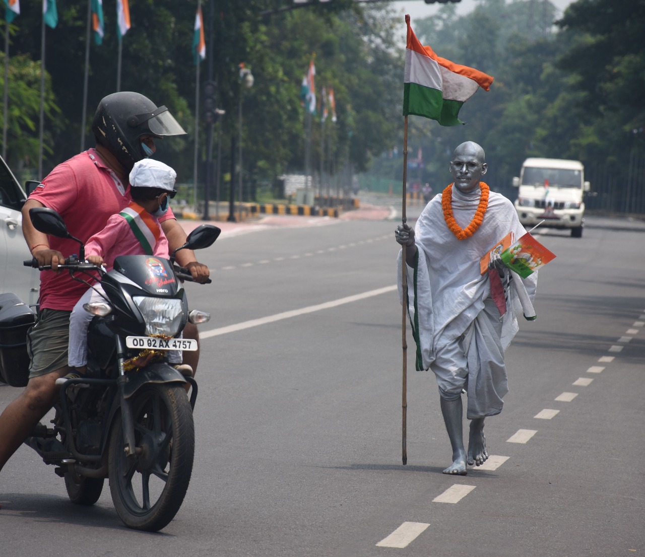 ୭୫ ତମ ସ୍ୱାଧୀନତାଦିବସ ଅବସରରେ ଜଣେ ଯୁବକ ଗାନ୍ଧୀବେଶ ଧରି ସଚିବାଳୟ ମାର୍ଗ ରାସ୍ତାରେ ରେ ଯାଉଛନ୍ତି