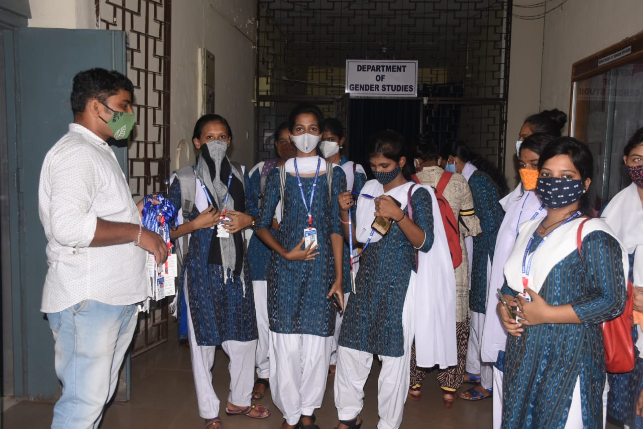 ଭୁବନେଶ୍ୱରର ରମାଦେବୀ ବିଶ୍ୱବିଦ୍ୟାଳୟର ୟୁଜି ଆର୍ଟ ଛାତ୍ରୀମାନେ ଶ୍ରେଣୀରେ ଯୋଗଦେବା ପୂର୍ବରୁ ସେମାନଙ୍କର ପରିଚୟ ପତ୍ର ପ୍ରଦର୍ଶନ କରାଉଛନ୍ତି