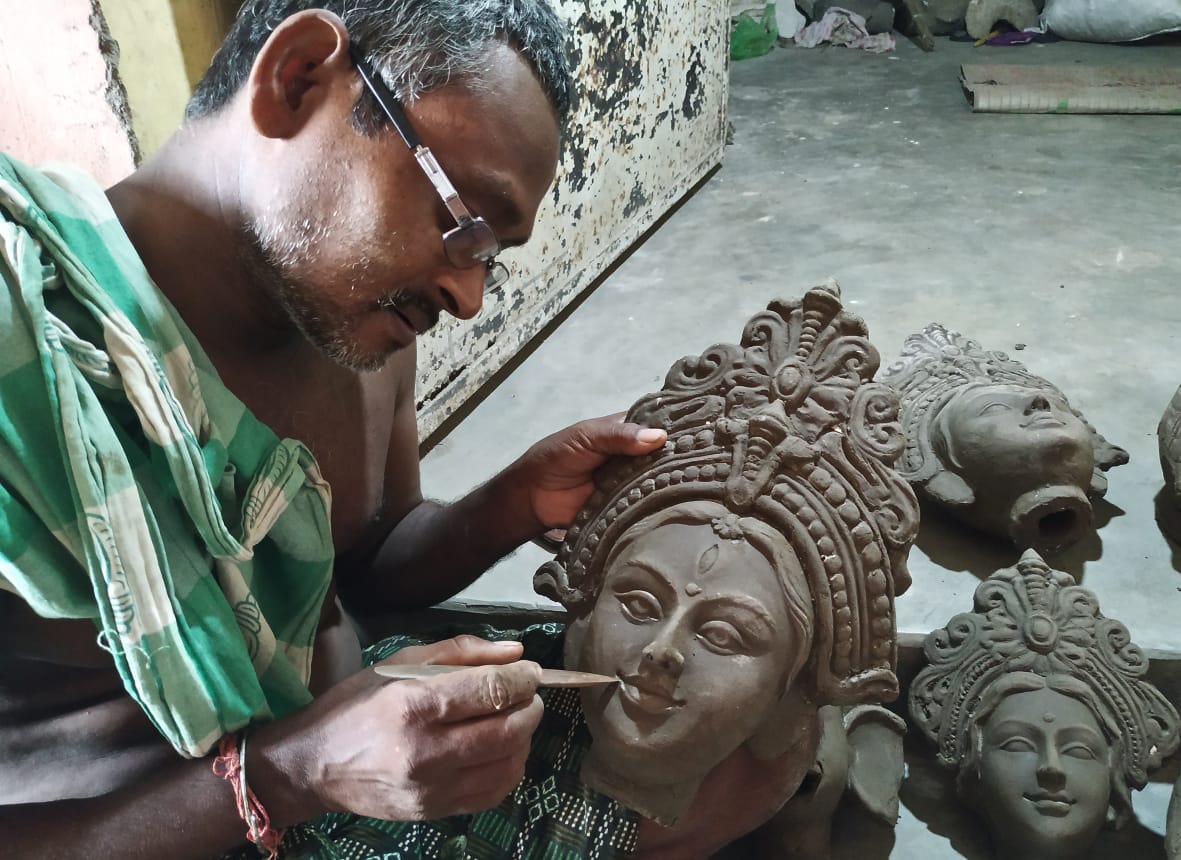 ଆଗକୁ ଆସୁଛି ଦଶହରା କଟକ ଅଂଚଳର ଚାନ୍ଦିନୀ ଚୌକ ଠାରେ ଜଣେ କାରିଗର ମା ଦୁର୍ଗାଙ୍କ ମୂର୍ତି ଗଢୁଛନ୍ତି