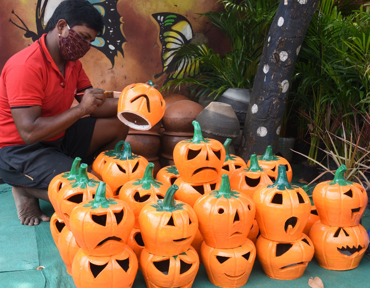 ଭୁବନେଶ୍ୱରର ୟୁନିଟ୍-୨ ଅଞ୍ଚଳରେ ଜଣେ କଳାକାର ମାଟିରେ ତିଆରି ପାତ୍ରରେ ରଙ୍ଗ କରୁଛନ୍ତି