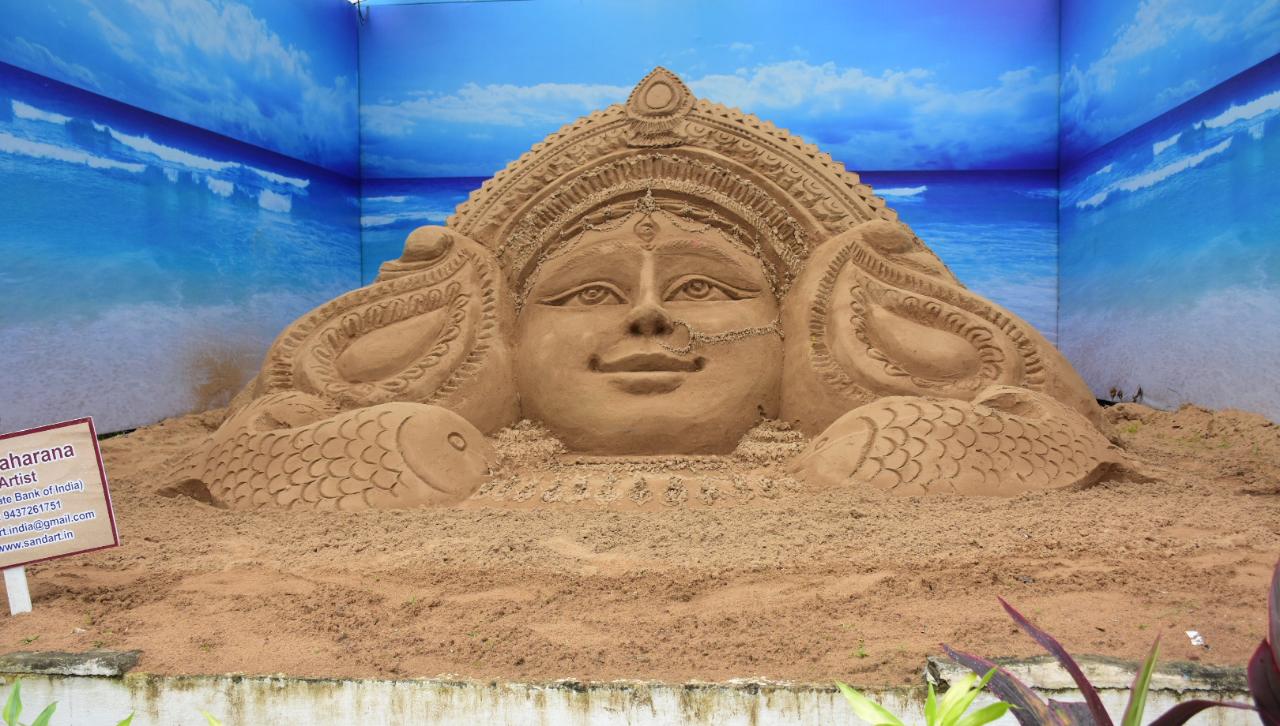 ବାଲୁକା ଶିଳ୍ପୀ ସୁବଳ ମହାରଣା ଭୁବନେଶ୍ୱରର ୟୁନିଟ୍-୧ ଏସବିଆଇ କାର୍ଯ୍ୟାଳୟରେ ବିଜୟାଦଶମି ଉପଲକ୍ଷେ ଦେବୀ ଦୁର୍ଗାଙ୍କ ଏକ ବାଲୁକା କଳା ପ୍ରସ୍ତୁତ କରିଛନ୍ତି