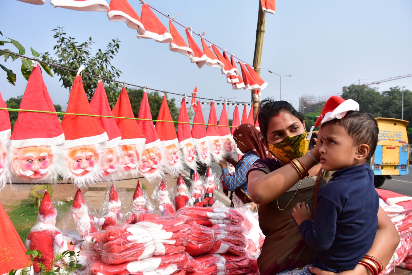 ଭୁବନେଶ୍ୱରର ନୟାପଲ୍ଲୀ ଦେଇ ଯାଇଥିବା ଜାତୀୟ ରାଜପଥ ନିକଟରୁ ଜଣେ ମହିଳା ସାଂଟା କ୍ୟାପ୍ କିଣୁଛନ୍ତି