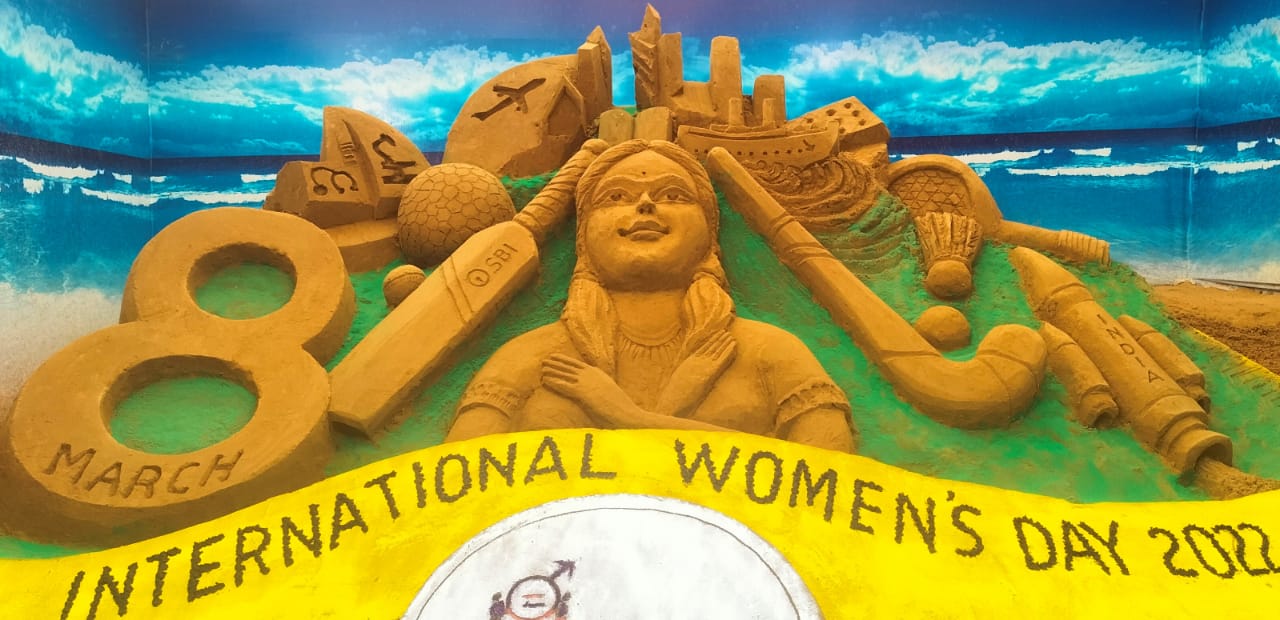 ଜାତୀୟ ମହିଳା ଦିବସ ଅବସରରେ ବାଲୁକା ଶିଳ୍ପୀ ସୁବଳ ମହାରଣା ରବୀନ୍ଦ୍ର ମଣ୍ଡପ ସମୁଖରେ ବାଲୁକାକଳା ପ୍ରଦର୍ଶନ କରୁଛନ୍ତି