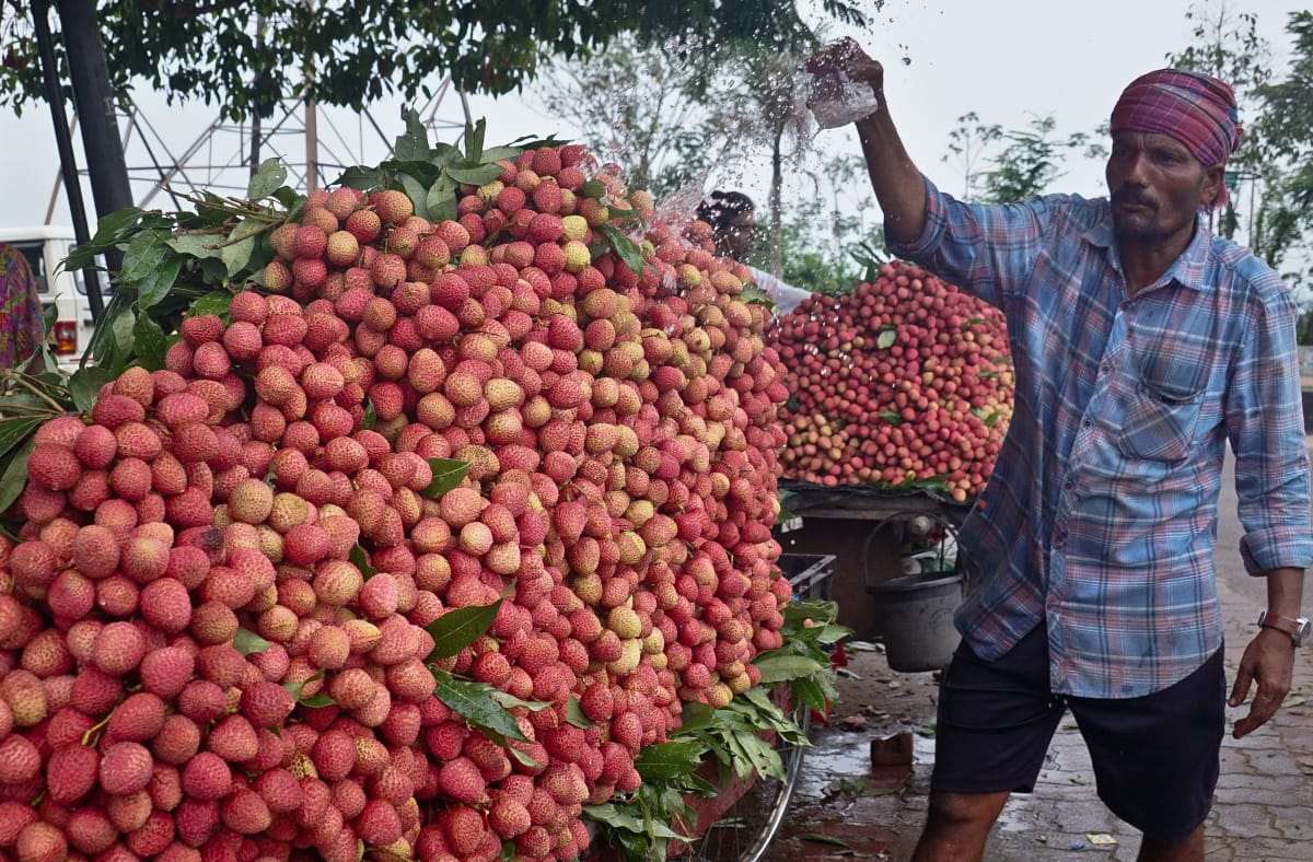 କଟକ ଜୋବ୍ରା ଅଞ୍ଚଳରେ ଜଣେ ବିକ୍ରେତା ଲିଚୁକୋଳି ଉପରେ ପାଣି ଛିଞ୍ଚୁଛନ୍ତି