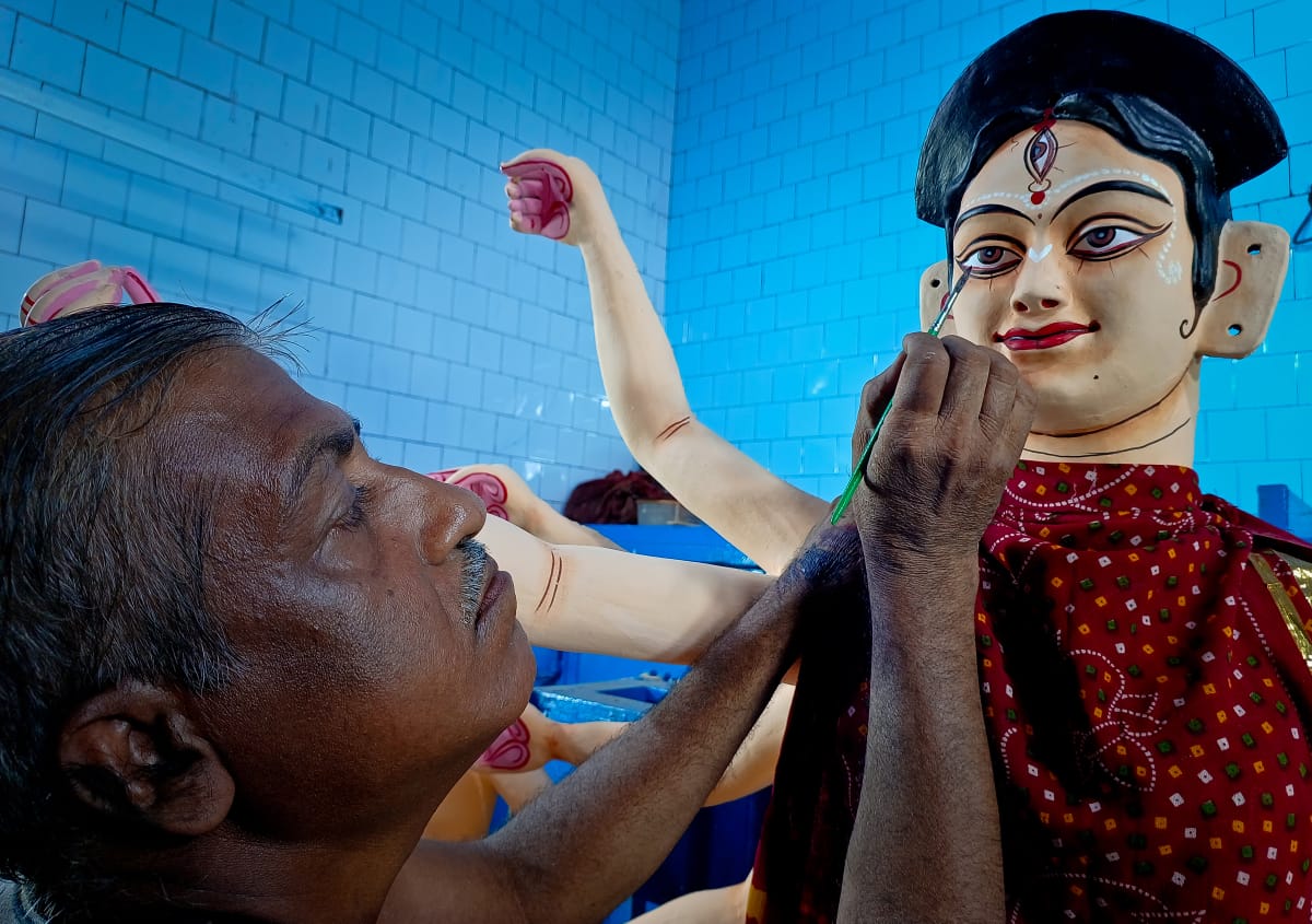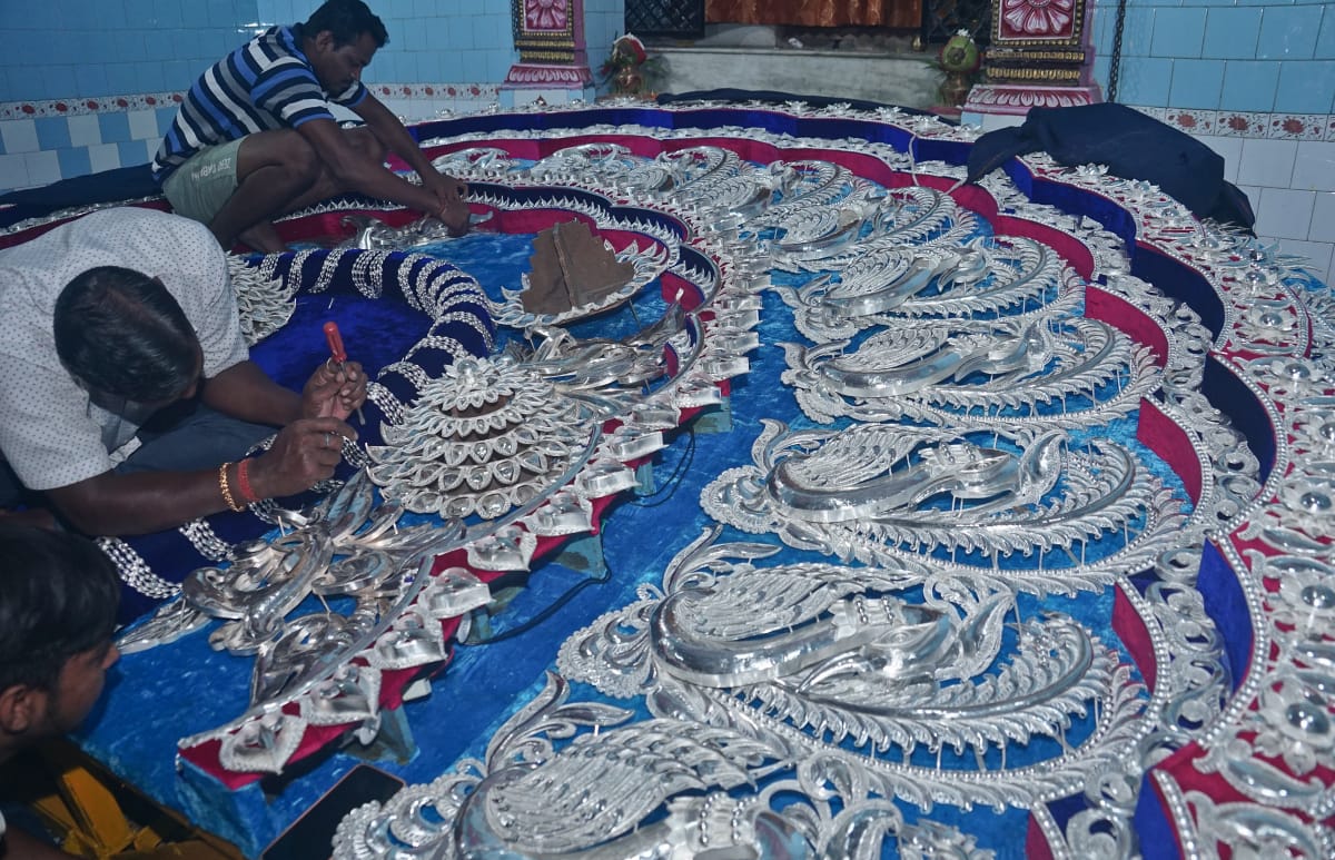 ଖାନଗର ପୂଜା ମଣ୍ଡପରେ ମେଧାରେ ଚାନ୍ଦି ଅଳଙ୍କାର ସଯିତ କରୁଥିବା କାରିଗର