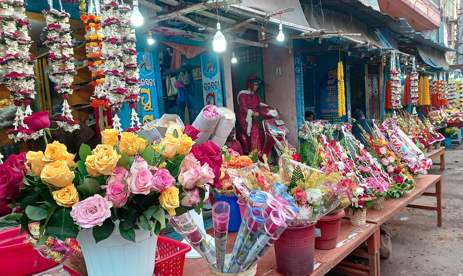 ନବ ବର୍ଷର ଶୁଭେଚ୍ଛା ପାଇଁ ଗୌରୀ ଶଙ୍କର ପାର୍କ ନିକଟରେ ଥିବା ଫୁଲ ଦୋକାନ ସମ୍ମୁଖରେ ବିକ୍ରୟ ପାଇଁ ରଖା ଯାଇଥିବା ଫୁଲ