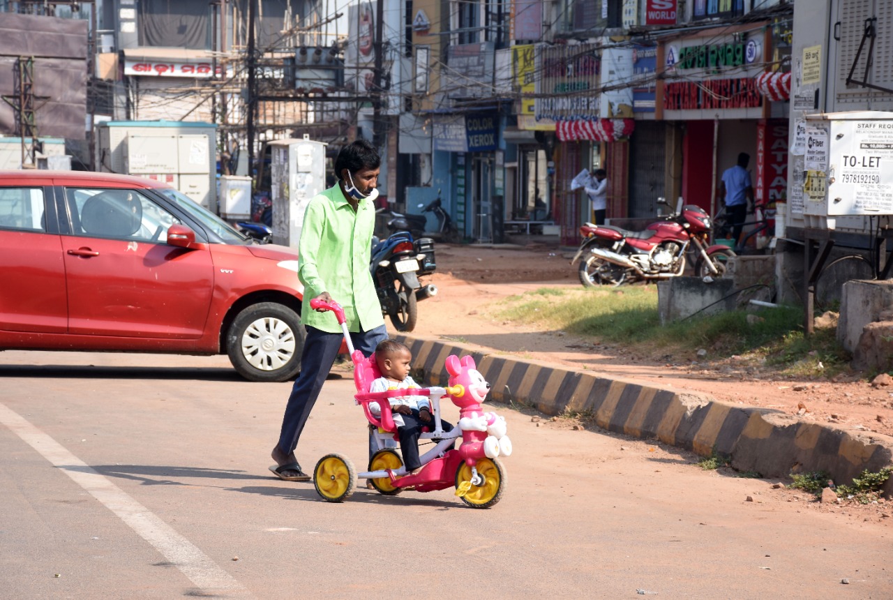 ଜଣେ ବ୍ୟକ୍ତି ନିଜ ଛୁଆକୁ ପ୍ରବଳ ଖରାରେ ଏକ ଶିଶୁ-ଷ୍ଟ୍ରୋଲର୍ ଉପରେ ନେଇଯାଉଛନ୍ତି