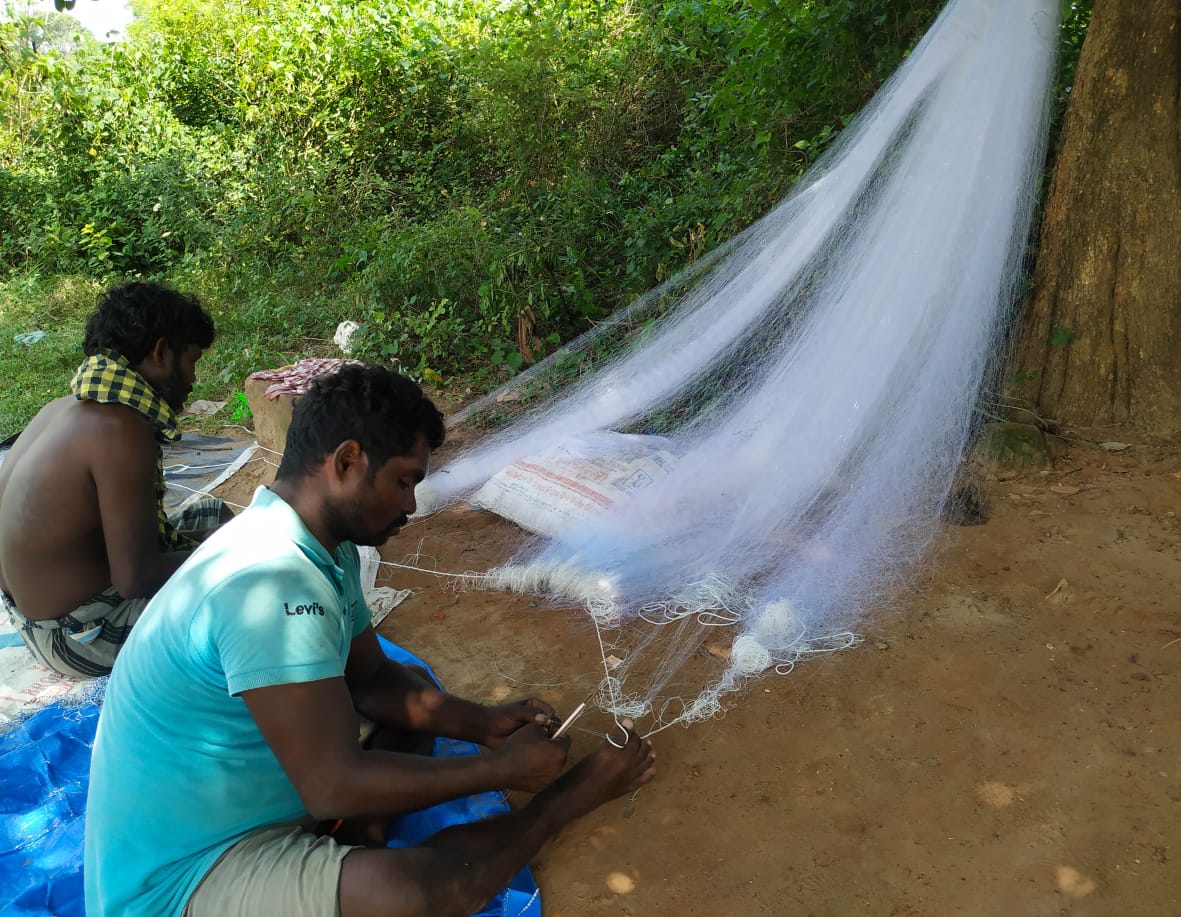 କଟକ ର କାଠଯୋଡି ନଦୀ ପାଶ୍ୱର୍ରେ ଦୁଇଜଣ ବ୍ୟକ୍ତି ମାଛ ଧରା ଜାଲ ବୁଣୁଛନ୍ତି