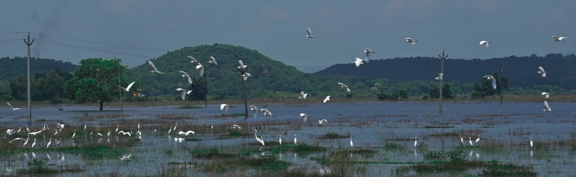 ବନ୍ୟା ଜଳ ପ୍ରବାହିତ ହେଉଥିବା ବେଳେ ବଗ ମାନେ ଖାଦ୍ୟ ଅନୁସନ୍ଧାନରେ ଘୁରି ବୁଲୁଛନ୍ତି