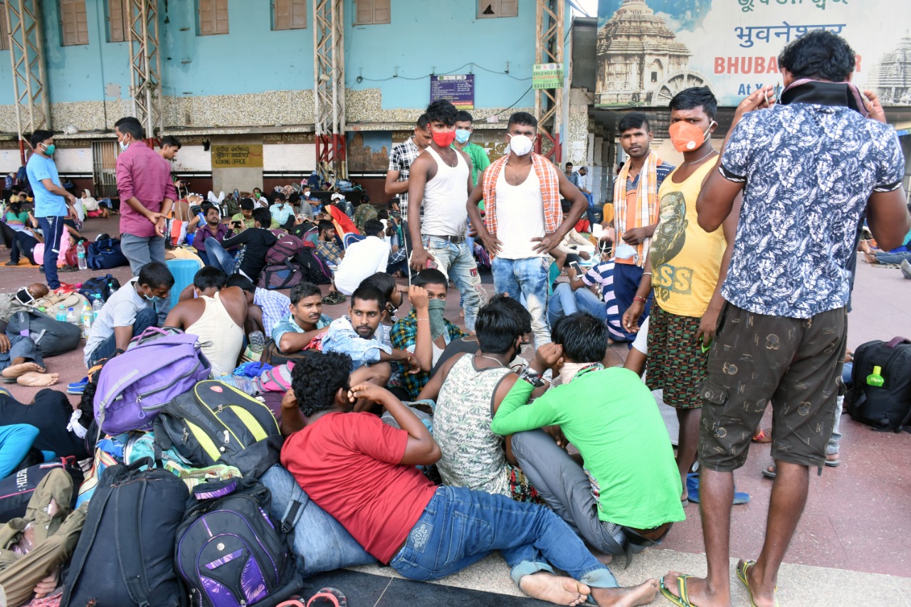 ଯାତ୍ରୀମାନେ ଭୁବନେଶ୍ୱର ରେଳ ଷ୍ଟେସନରେ ସେମାନଙ୍କ ଟ୍ରେନକୁ ଅପେକ୍ଷା କରୁଥିବାବେଳେ ସାମାଜିକ ଦୂରତା ନିୟମକୁ ଖଣ୍ଡନ କରୁଛନ୍ତି