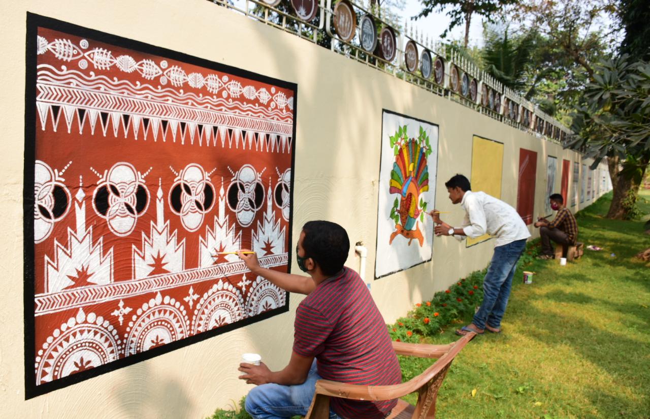 ଭୁବନେଶ୍ୱରର ସିଆରପି ଛକରେ ଥିବା ରାଜ୍ୟ ଆଦିବାସୀ ସଂଗ୍ରହାଳୟ ର ପାଚେରୀ ରେ କଳାକାରମାନେ ଚିତ୍ର ଆଙ୍କୁଛନ୍ତି