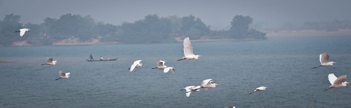 ହାଲୁକା କୁହୁଡ଼ି ମଧ୍ୟରେ କଟକର ମହାନାଦୀ ଉପରେ ଉଡୁଥିବା ପକ୍ଷୀମାଙ୍କ ଦୃଶ୍ୟ