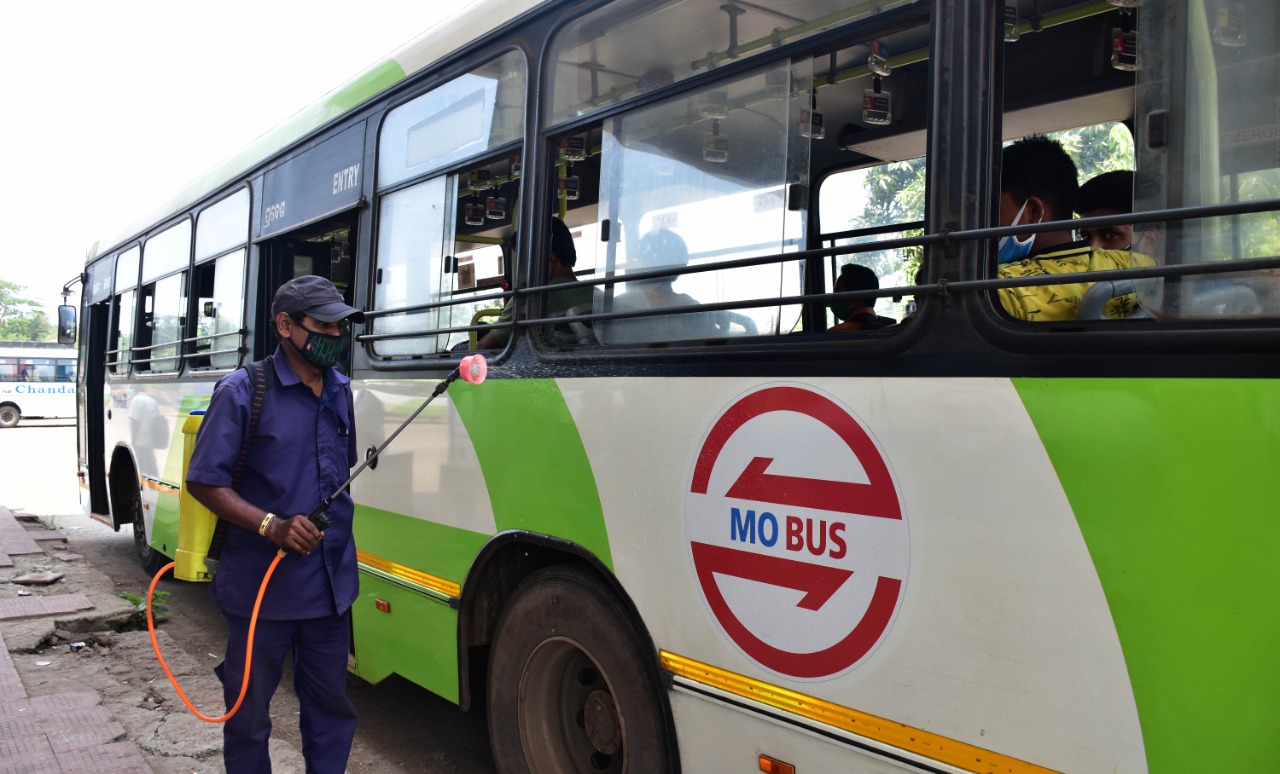 ଭୁବନେଶ୍ୱର ମାଷ୍ଟର କ୍ୟାଣ୍ଟିନ ଛକଠାରେ ସ୍ୱାସ୍ଥ୍ୟ କର୍ମଚାରୀ ମାନେ ବିଏମସି ର ମୋ ବସ ଗୁଡିକୁ ସାନିଟାଇଜ କରୁଛନ୍ତି
