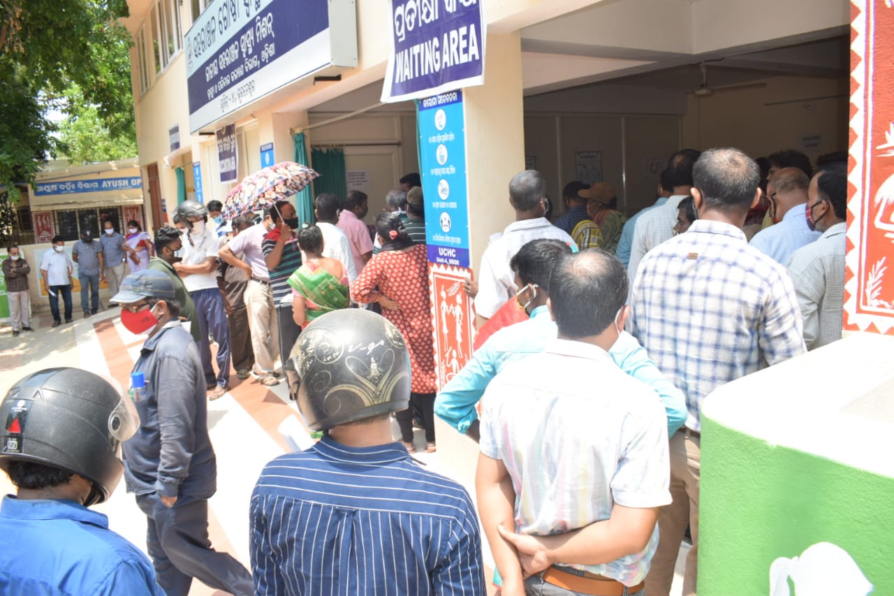 ସାମାଜିକ ଦୂରତା କୁ ନମାନି ୟୁନିଟ୪ ସହରାଂଚଳ ଗୋଷ୍ଠୀ ସ୍ୱାସ୍ଥ୍ୟକେନ୍ଦ୍ର ପରିସରରେ କୋଭିଡ ଟୀକା ନବା କୁ ଲୋକଙ୍କ ଭିଡ
