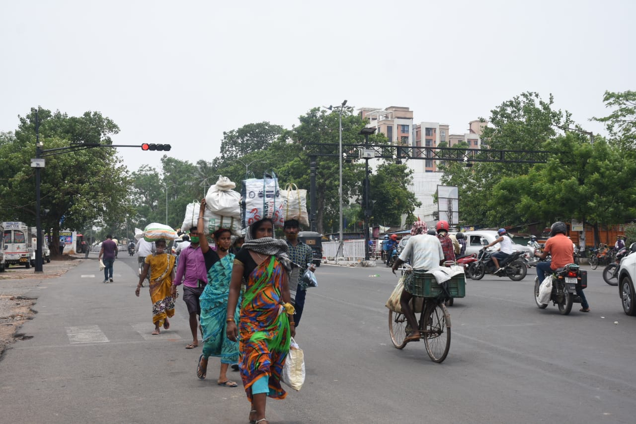 କଳ୍ପନା ଛକରେ ହାଟରୁ ପରିବା ଓ ସଉଦା କିଣି ମହିଳା ମାନେ ମୁଣ୍ଡରେ ମୁଣ୍ଡାଇ ଘରକୁ ଯାଉଛନ୍ତି