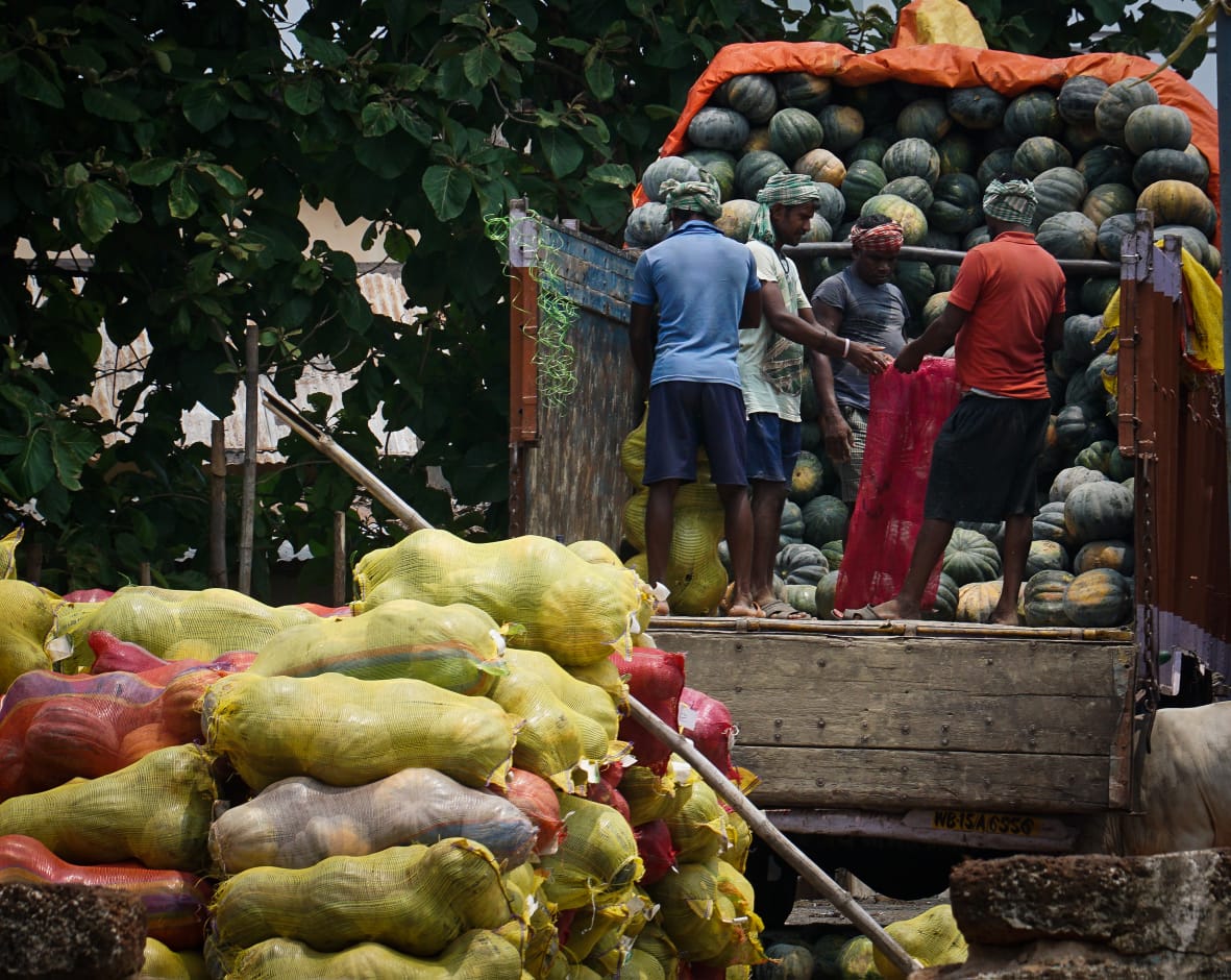 ଛତ୍ର ବଜ଼ାର ପରିବା ଗୋଡାଉନ ସମ୍ମୁଖ ରେ ଟ୍ରକ ରୁ ଖଲାସ କରାଯାଉଥିବା କଖାରୁ