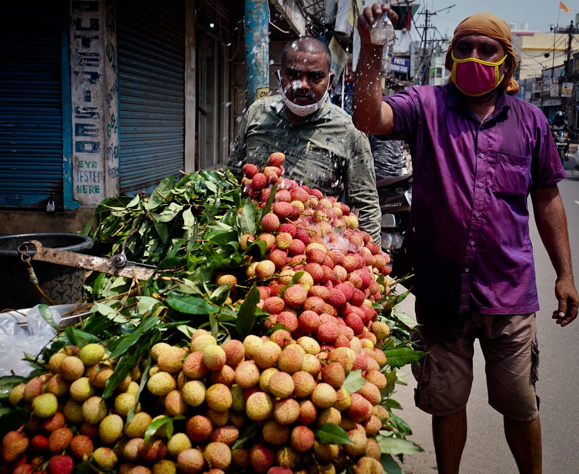 ମଙ୍ଗଳାବାଗ ରୋଡ ପାର୍ଶ୍ୱରେ ଜଣେ ବ୍ୟବସାୟୀ ଲିଚୁ ଫଳ ଗୁଡିକୁ ସତେଜ ରଖିବା ପାଇଁ ଜଳ ଛିଞ୍ଚନ କରୁଛନ୍ତି