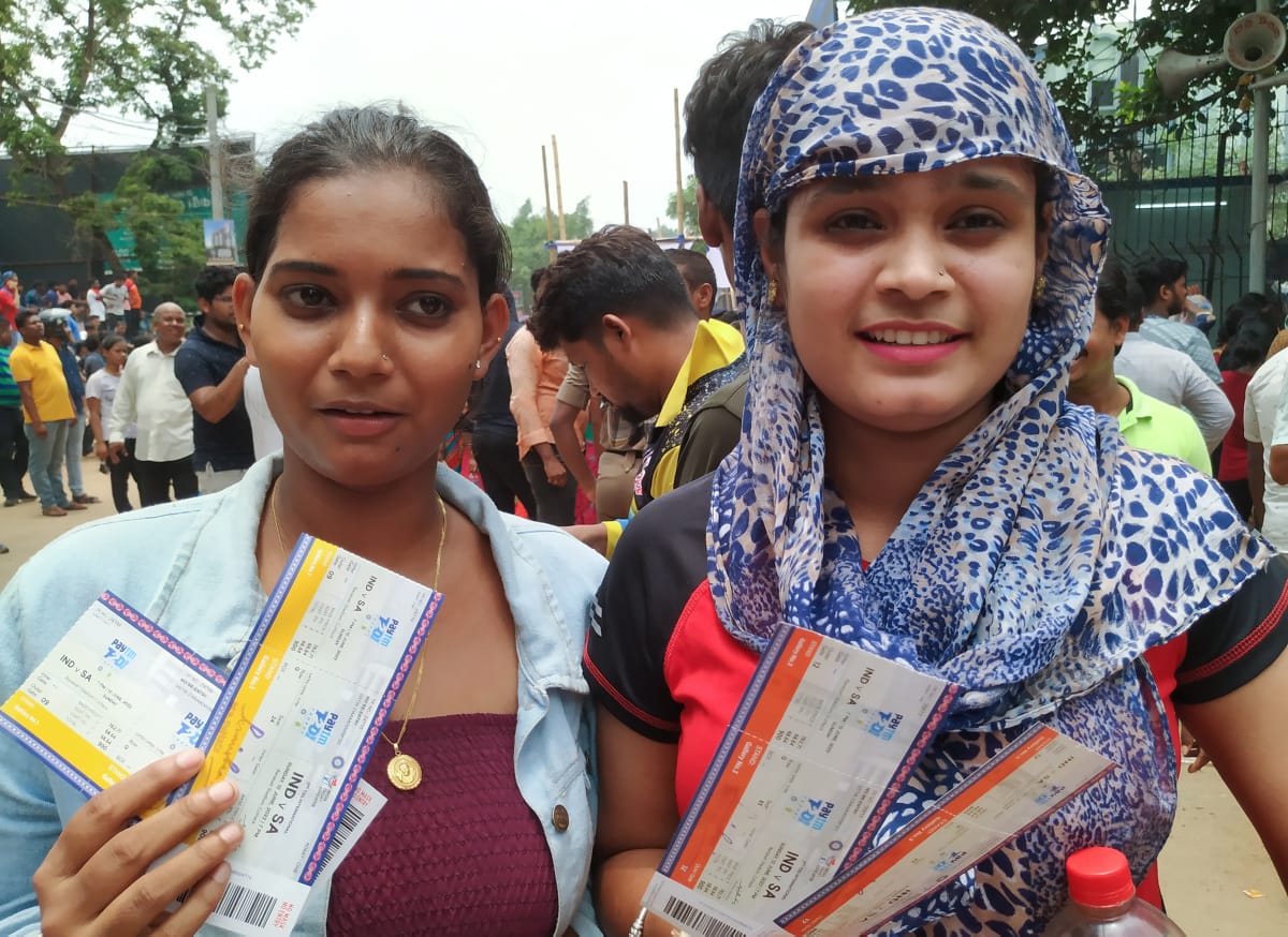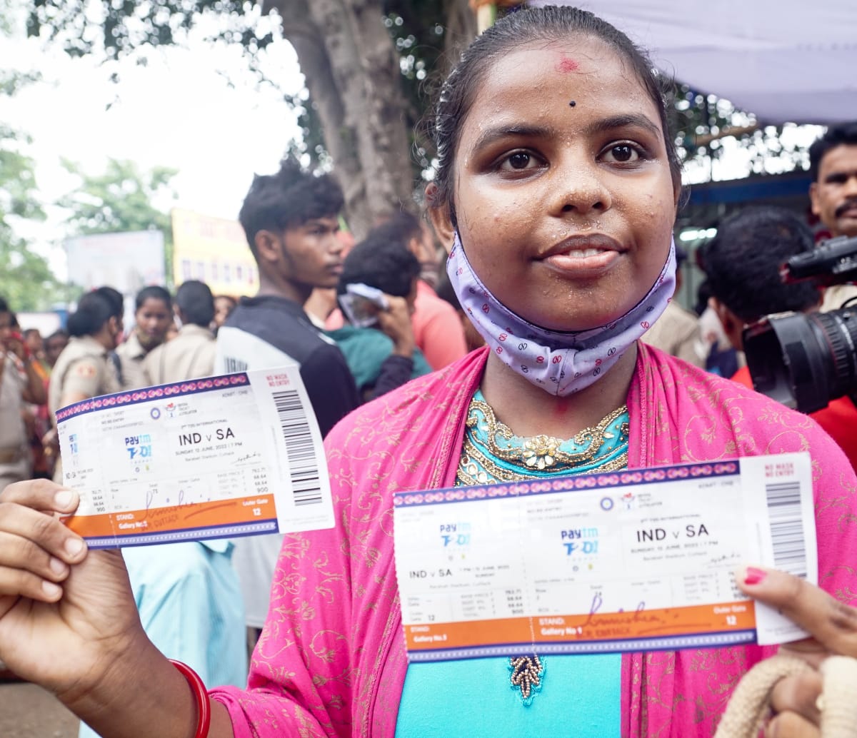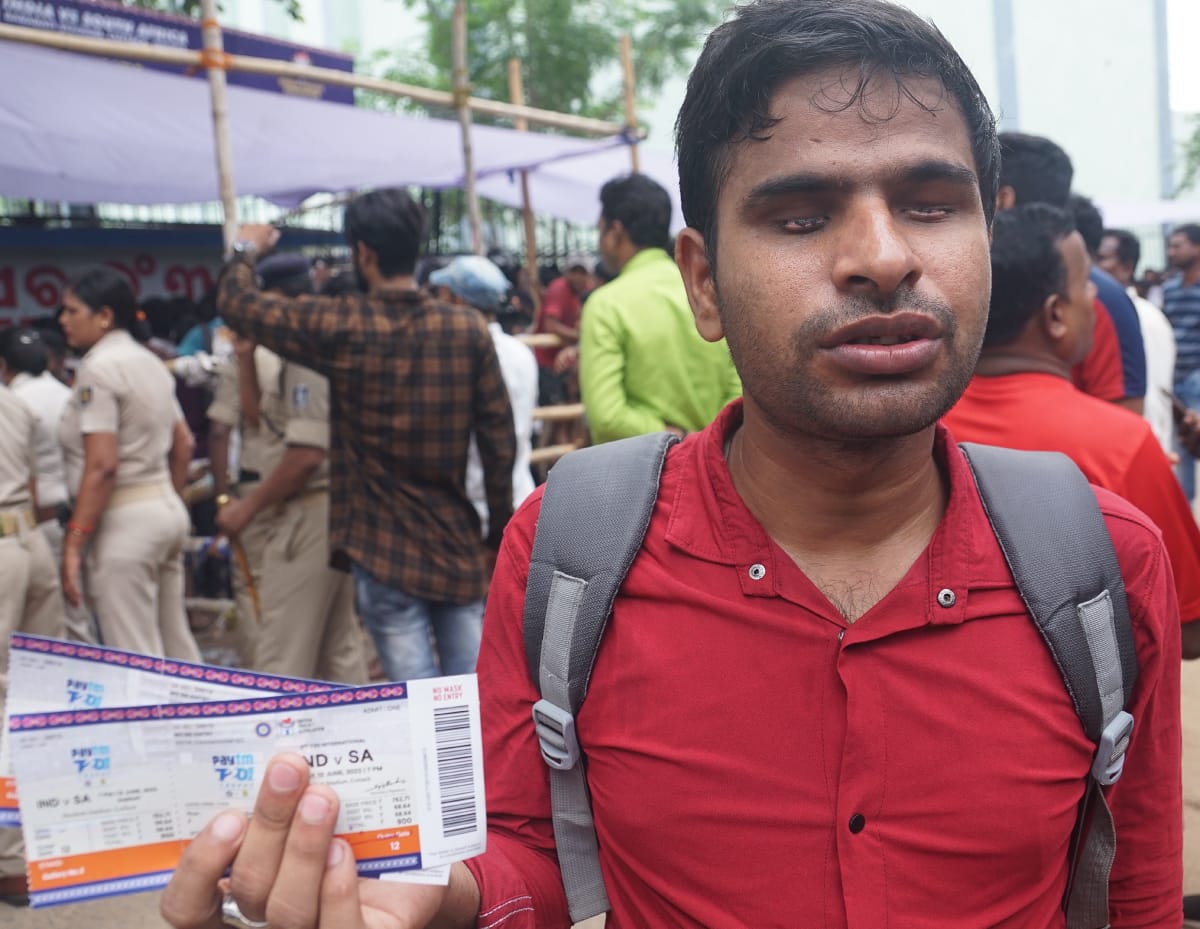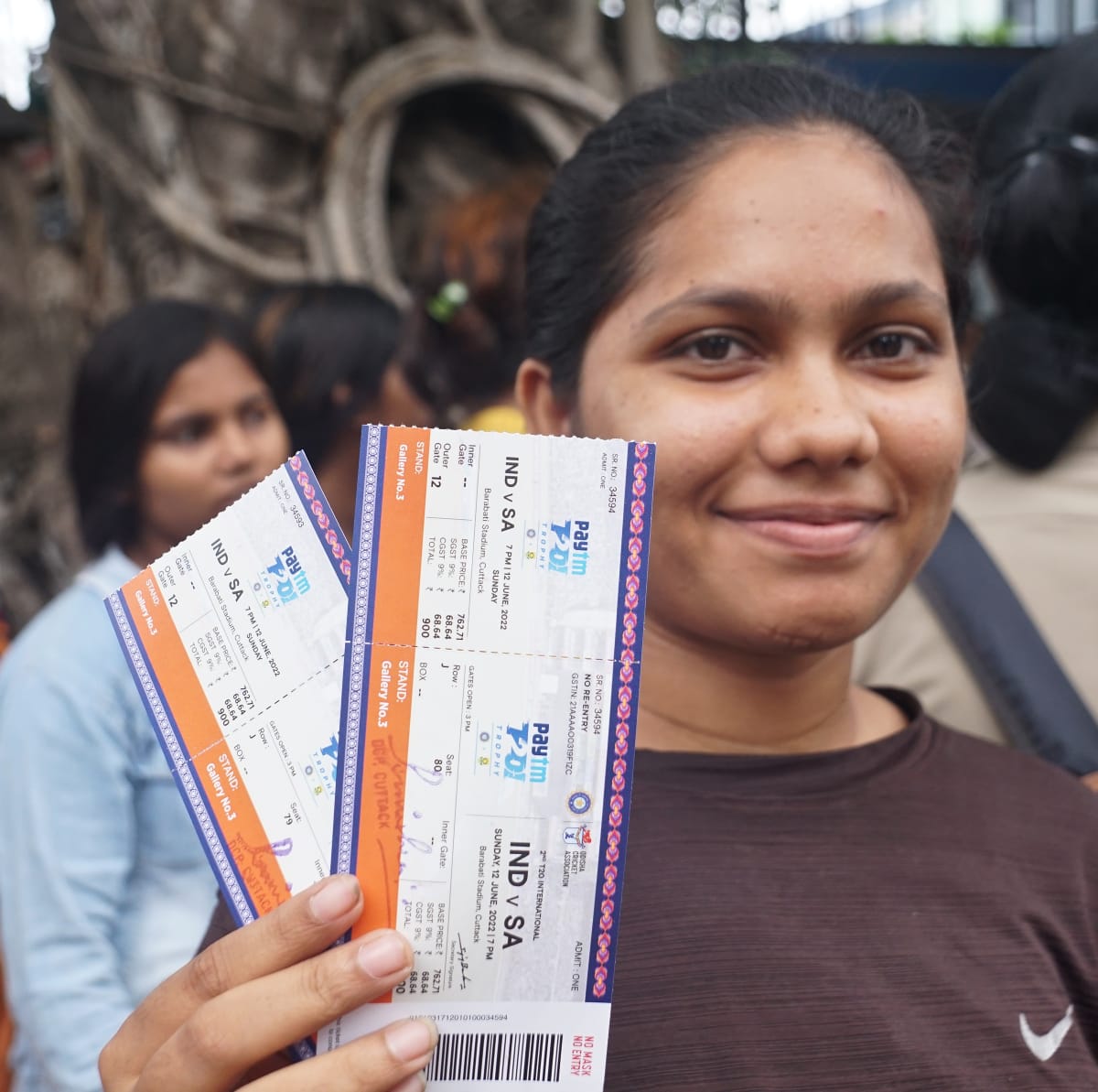 ପ୍ରଶଂସକମାନେ ଖୁସିରେ ଭାରତ ବନାମ ଦକ୍ଷିଣ ଆଫ୍ରିକା ଟି -୨୦ କ୍ରିକେଟ୍ ମ୍ୟାଚ୍ ଟିକେଟ୍ ପାଇସାରିବା ପରେ ଖୁସିରେ ଟିକେଟ୍ ପ୍ରଦର୍ଶନ କରୁଛନ୍ତି