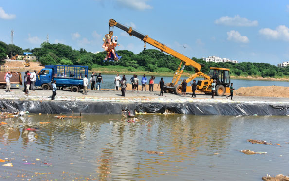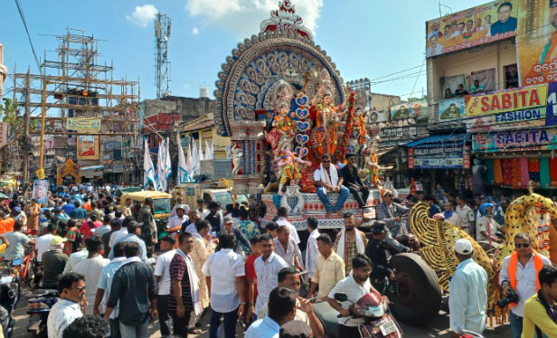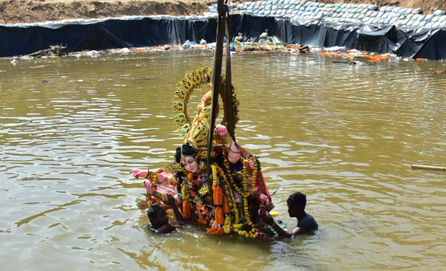 କୁଆଖାଇ ନଦୀ ଅସ୍ଥାୟୀ ପୋଖରୀରେ ଭକ୍ତମାନେ ମା ଦୁର୍ଗାଙ୍କୁ ଵିସର୍ଜନ କରିବାପାଇଁ ନେଉଛନ୍ତି