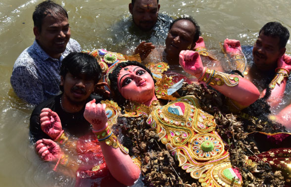 କୁଆଖାଇ ନଦୀ ଅସ୍ଥାୟୀ ପୋଖରୀରେ ଭକ୍ତମାନେ ମା ଦୁର୍ଗାଙ୍କୁ ଵିସର୍ଜନ କରିବାପାଇଁ ନେଉଛନ୍ତି