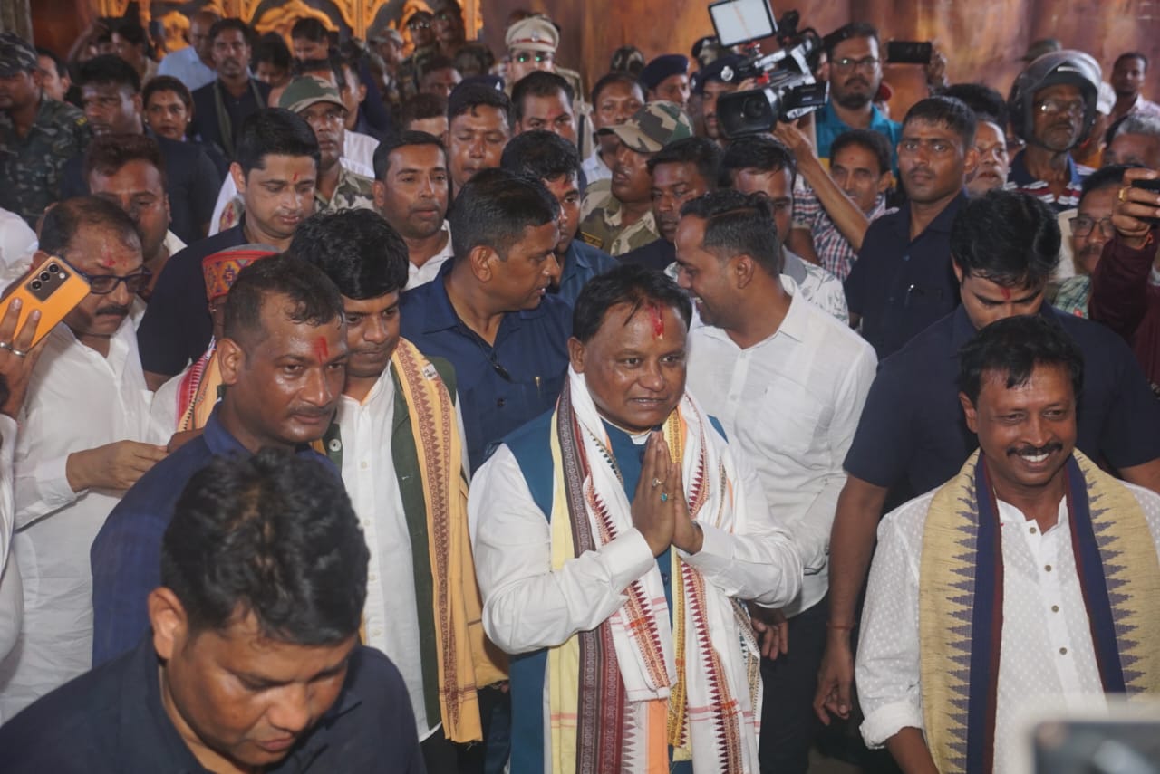ମୁଖ୍ୟମନ୍ତ୍ରୀ ମୋହନ ଚରଣ ମାଝୀ କଟକ ସହରରେ ବିଭିନ୍ନ ପୂଜାମଣ୍ଡପ ପରିଦର୍ଶନ ଅବସରରେ ଖାନନଗର ପୂଜା ମଣ୍ଡପରେ ମୁଖ୍ୟମନ୍ତ୍ରୀଙ୍କୁ ପୂଜା କମିଟିରେ କର୍ମକର୍ତ୍ତା ପୁଷ୍ପଗୁଚ୍ଛ ଦେଇ ସ୍ୱାଗତ କରିଛନ୍ତି