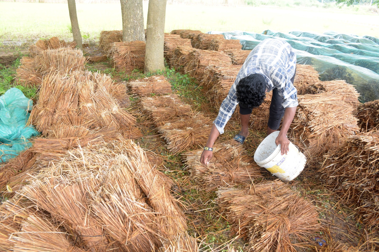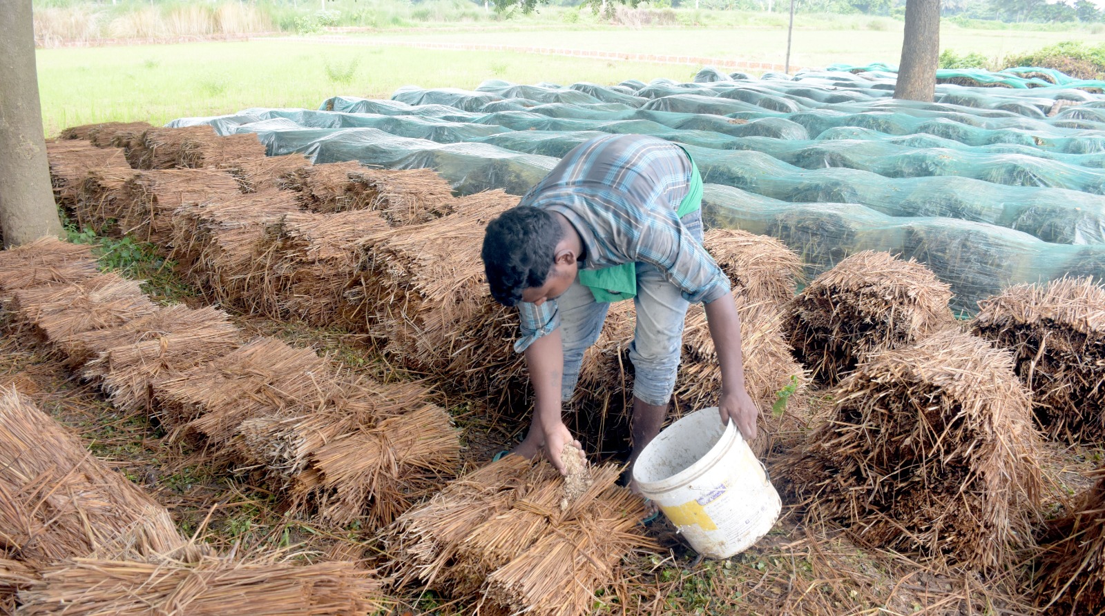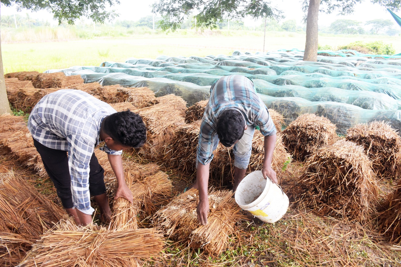 ପିପିଲି ଡିହ ସାହିରେ ଜଣେ ଛତୁ ଚାଷୀ ପାଲରେ ଛତୁ ମଞ୍ଜି ରଖୁଛନ୍ତି