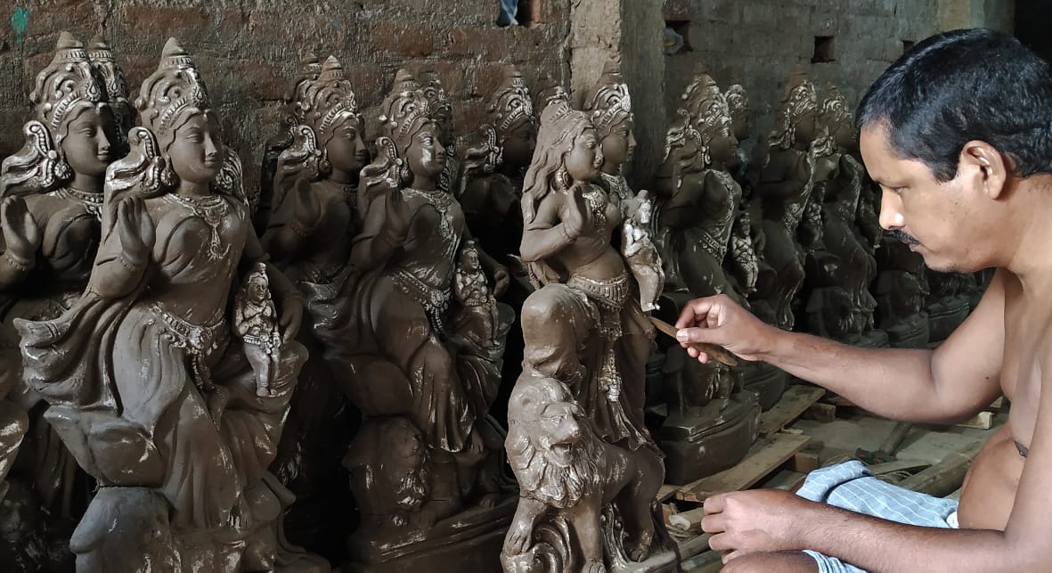 କଟକ କୁମ୍ଭାରସାହିଠାରେ ଜଣେ ଶିଳ୍ପୀ ଖୁଦୁରୁକୁଣି ମୂର୍ତ୍ତି ନିର୍ମାଣ କରୁଛନ୍ତି।