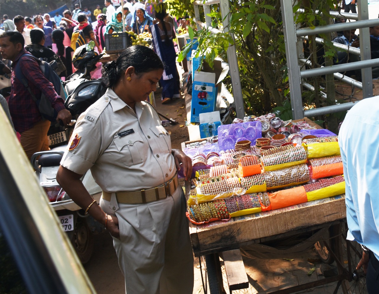 ଭୁବନେଶ୍ୱରର ପିଏମଜି ସ୍କୋୟାରରେ ଜଣେ ମହିଳା ପୋଲିସ ଅଧିକାରୀ ଚୁଡ଼ି କିଣୁଛନ୍ତି