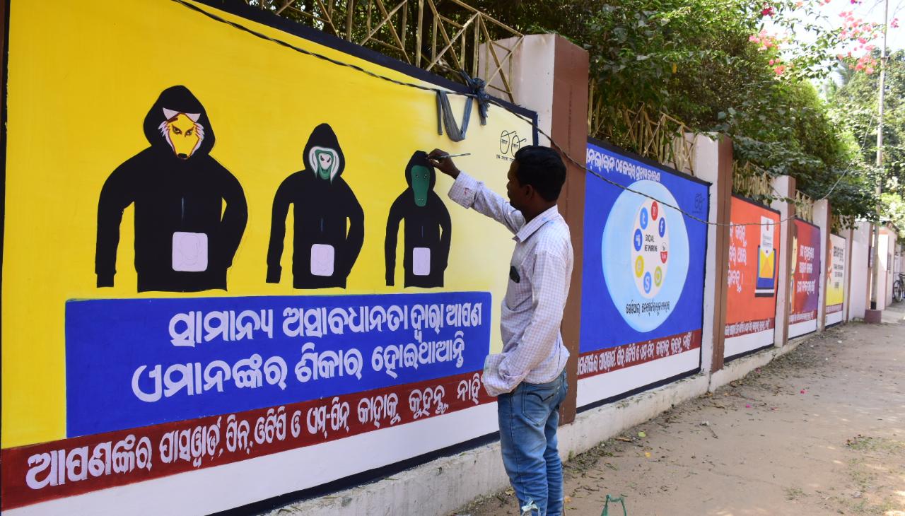 ଅନଲାଇନ କାରବାରରୁ ହେଉଥିବା ଠକେଇ ପାଇଁ ସଚେତନତା ସୃଷ୍ଟି କରିବାକୁ ଭୁବନେଶ୍ୱର ପିଏମଜି ରାସ୍ତା ପାର୍ଶ୍ଵ ପ୍ରାଚୀରରେ ଚିତ୍ର ଆଙ୍କୁଛନ୍ତି ଚିତ୍ରକାର