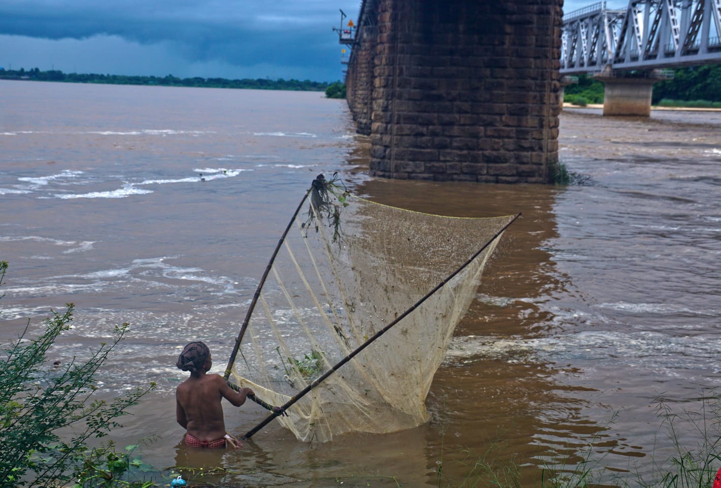 କଟକ ଯୋବ୍ରା ଆନିକଟ ଠାରେ ମହାନଦୀରେ ପ୍ରବାହିତ ବନ୍ୟା ଜଳରେ ଧୀବର ମାଛ ଧରୁଛନ୍ତି