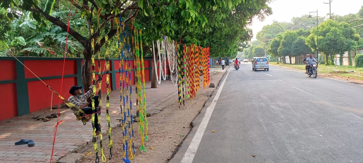 କଟକ କ୍ୟାଣ୍ଟନମେଣ୍ଟ ରୋଡ ପାର୍ଶ୍ୱରେ ପ୍ଲାଷ୍ଟିକ ଦୌଡ଼ିରେ ନିର୍ମିତ ଦୋଳି ବିକ୍ରୟ ପାଇଁ ଗ୍ରାହକଙ୍କ ଅପେକ୍ଷାରେ ବୁଲା ବ୍ୟବସାୟୀ