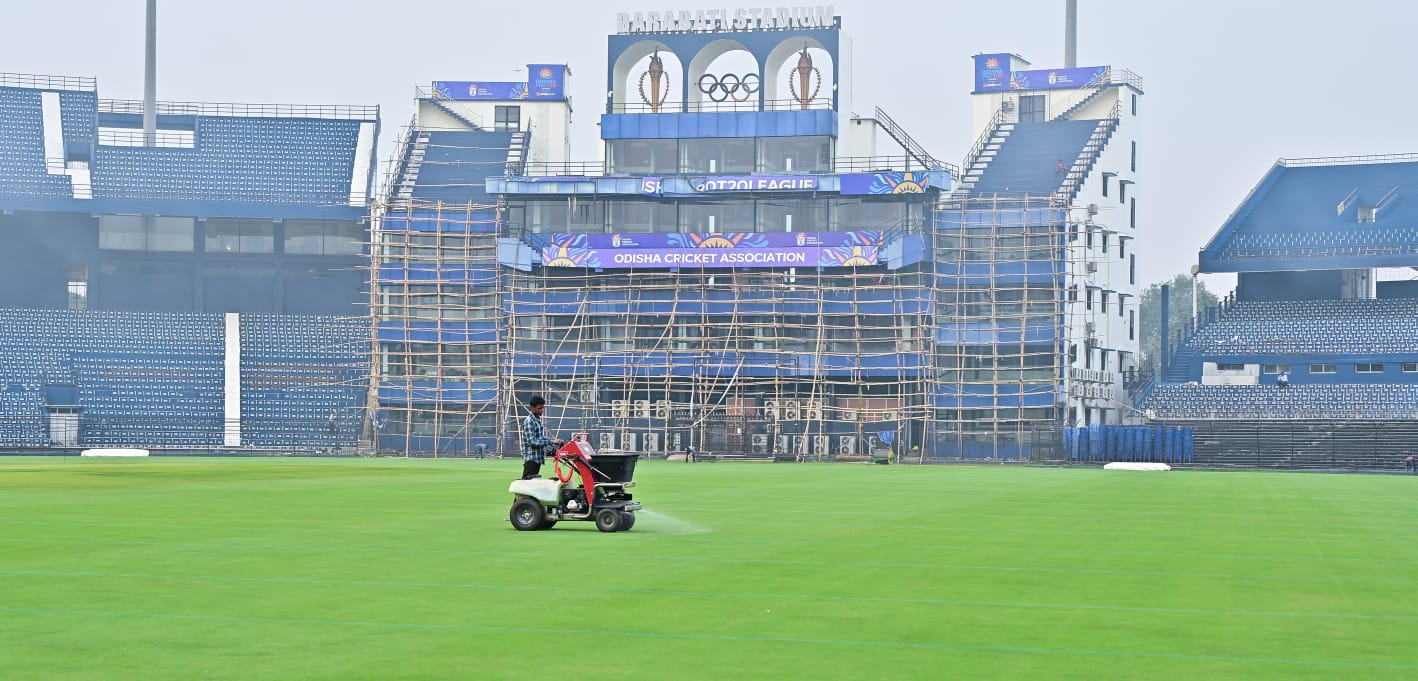 କଟକ ବାରବାଟୀ ଷ୍ଟାଡିଅମ ଗ୍ରାଉଣ୍ଡର ସୌନ୍ଦର୍ଯ୍ୟକରଣ ପାଇଁ ଘାସ ଉପରେ କେମିକାଲ ଜଳ ସିଞ୍ଚନ କରାଯାଉଛି