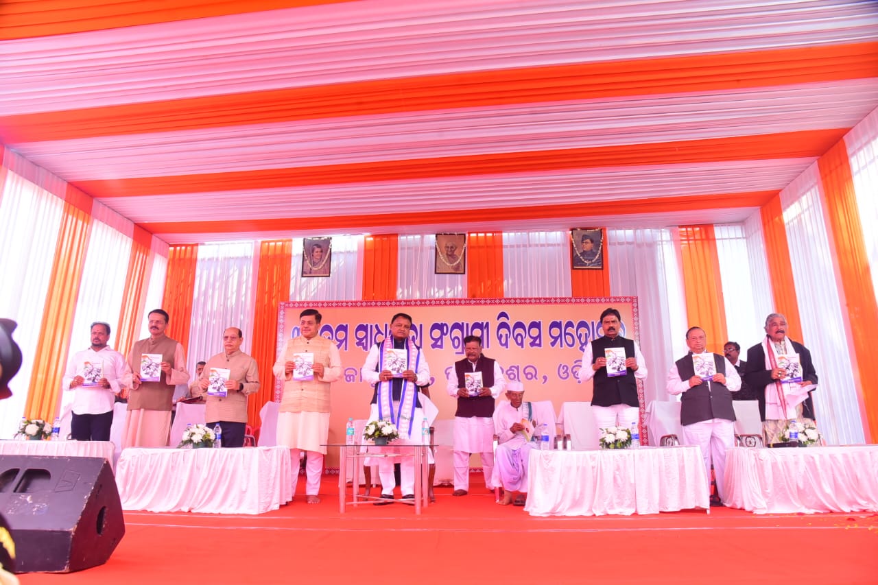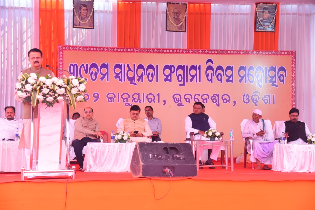 ଭୁବନେଶ୍ୱରସ୍ଥିତ ସ୍ୱାଧୀନତା ସଂଗ୍ରାମୀ ପଡ଼ିଆରେ ୩୯ତମ ସ୍ୱାଧୀନତା ସଂଗ୍ରାମୀ ଦିବସ ମହୋତ୍ସବରେ ମୁଖ୍ୟମନ୍ତ୍ରୀ ମୋହନ ଚରଣ ମାଝୀଙ୍କ ସହ ଅନ୍ୟ ଅତିଥି ଓ ଯୋଗଦେଇଥିବା ସ୍ୱାଧୀନତା ସଂଗ୍ରାମୀ ଏବଂ ଅନ୍ୟ ବରିଷ୍ଠ ବ୍ୟକ୍ତିବୃନ୍ଦ