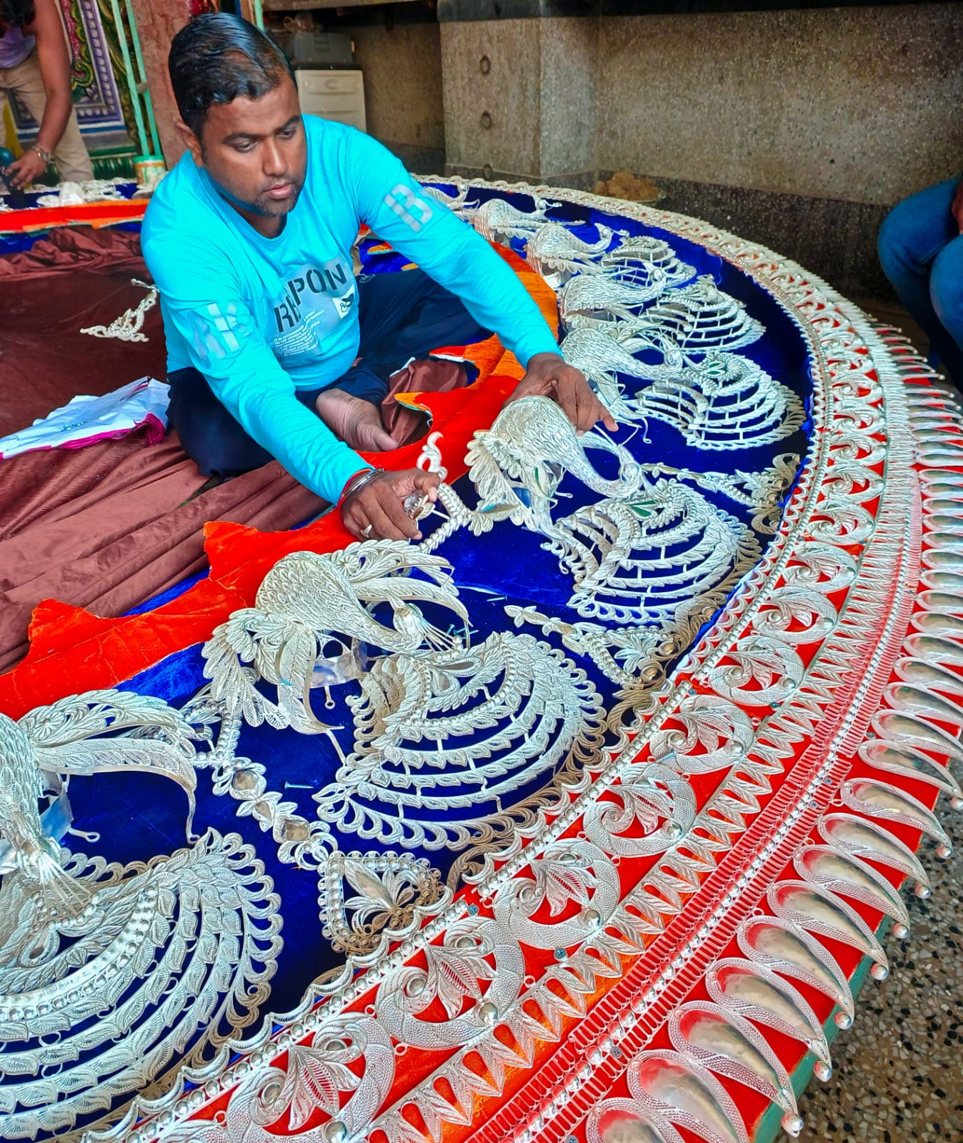 କଟକ ଶେଖ ବଜ଼ାର ପୂଜା ମଣ୍ଡପରେ ମେଢରେ ଚାନ୍ଦି ଅଳଙ୍କାର ଗୁଡିକ ଖଚିତ କରୁଥିବା କାରିଗର