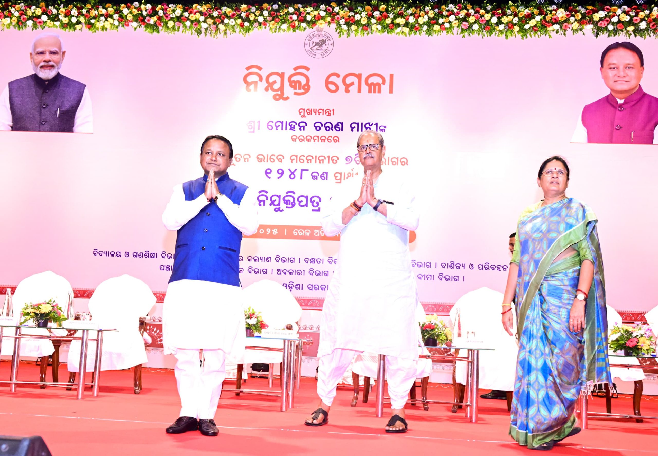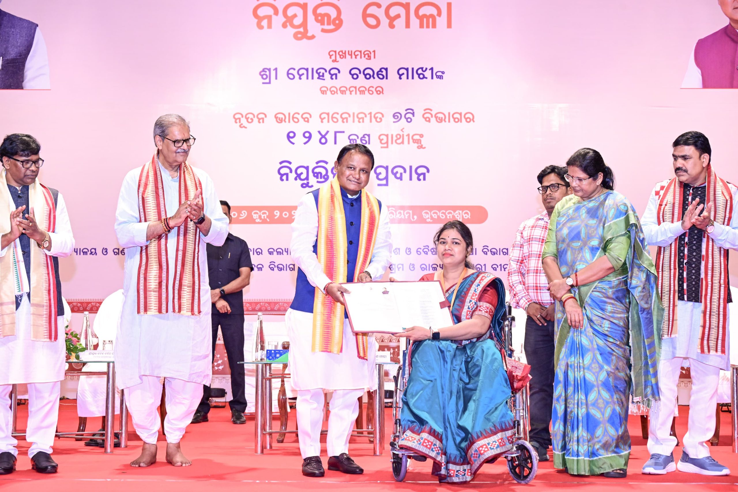 ଭୁବନେଶ୍ୱର ରେଳଭବନଠାରେ ଆୟୋଜିତ ନିଯୁକ୍ତି ମେଳାରେ ମୁଖ୍ୟମନ୍ତ୍ରୀ ମୋହନ ଚରଣ ମାଝୀ ନିଯୁକ୍ତି ପତ୍ର ପ୍ରଦାନ କରୁଛନ୍ତି