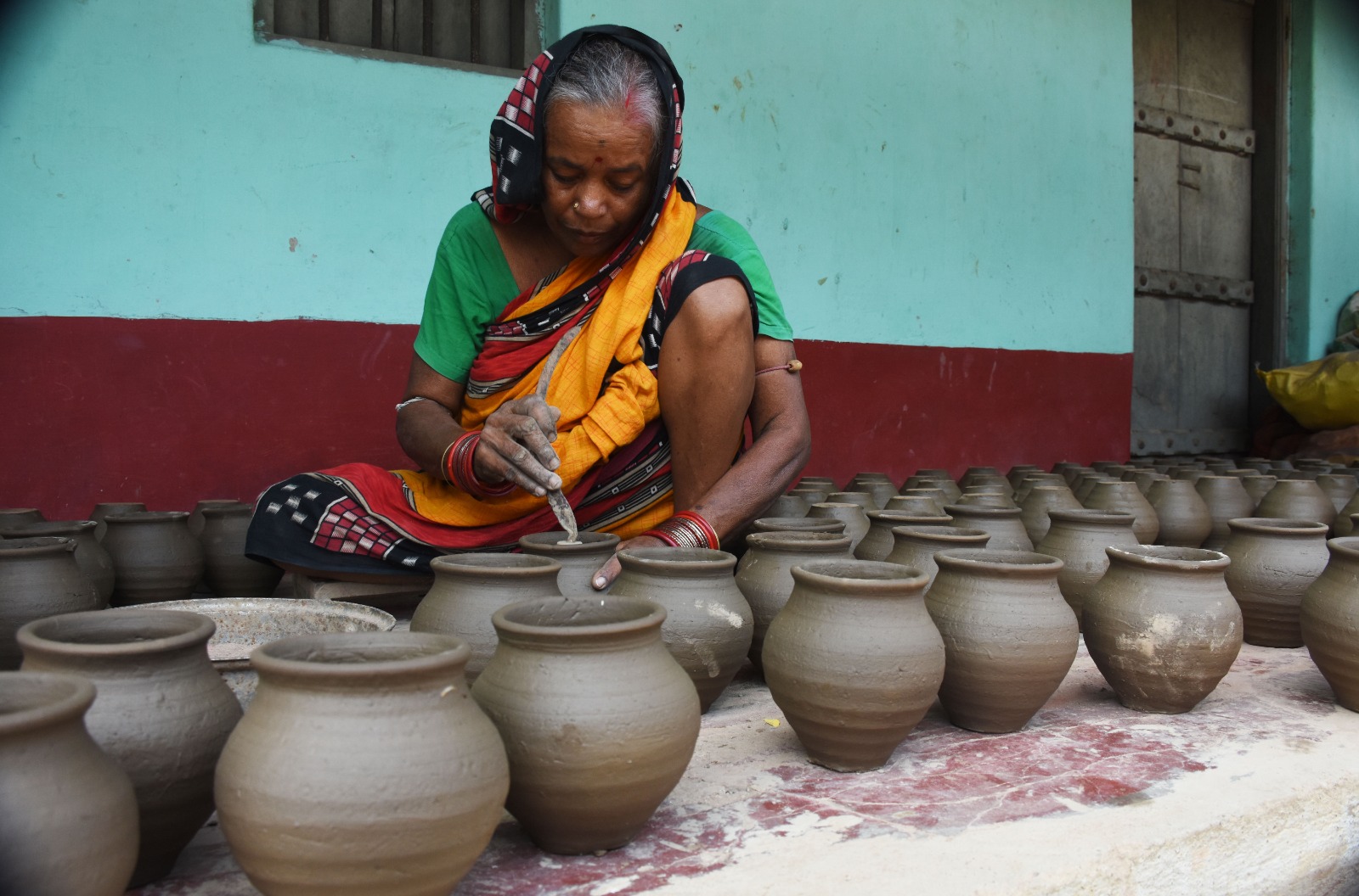ଭୁବନେଶ୍ୱର ଧଉଳିଥାନା ଉପକଣ୍ଠ ବସନ୍ତପୁରରେ ଜଣେ ମହିଳା ମାଟି ପାତ୍ର ଗଢୁଛନ୍ତି